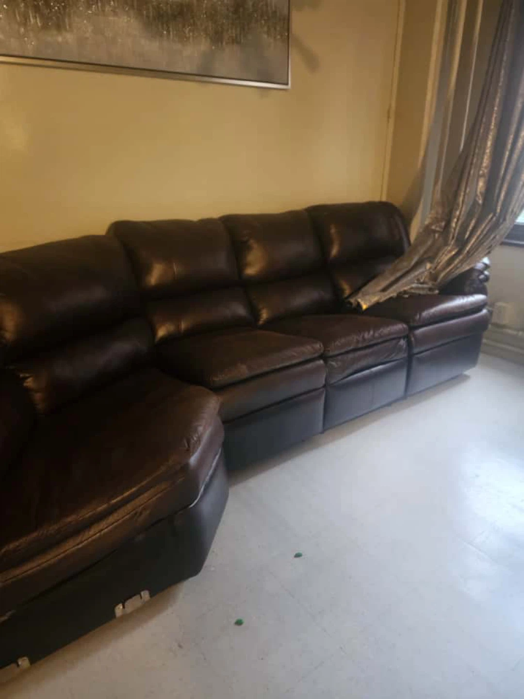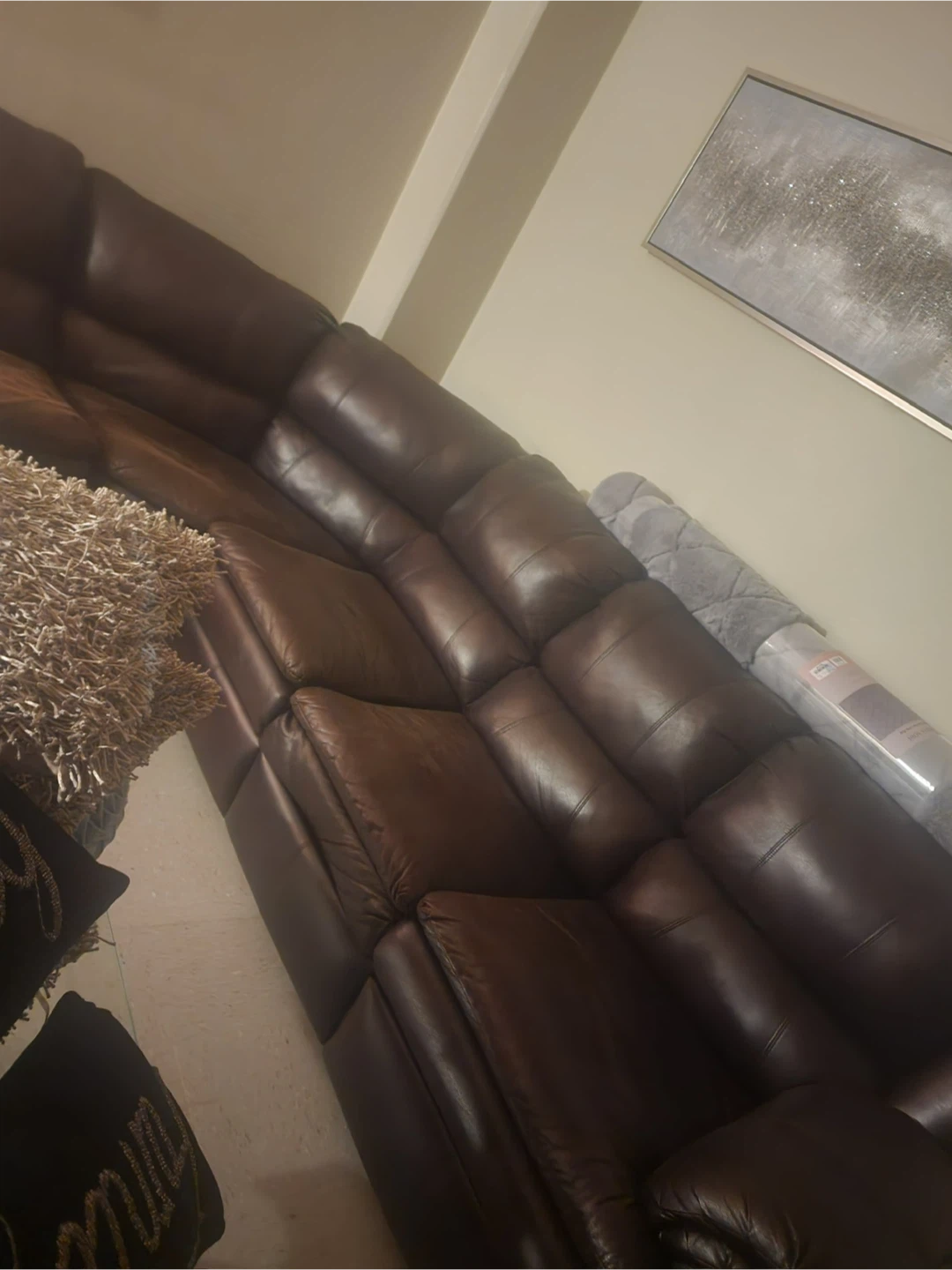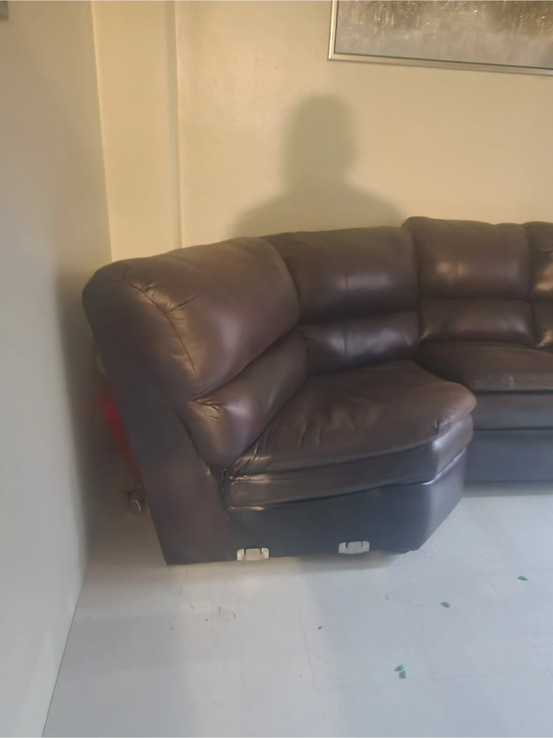 Selling a comfortable brown leather sectional sofa. It's in good condition and ready for a new home. Perfect for a living room or entertainment area. The leather is soft and the cushions are plush, making it a great place to relax