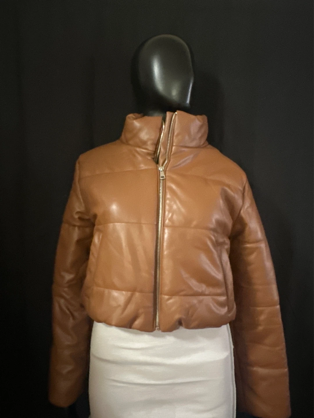 Brown puffer jacket with a faux leather finish. It has a zip-up front and a high collar. Made from a PU material.