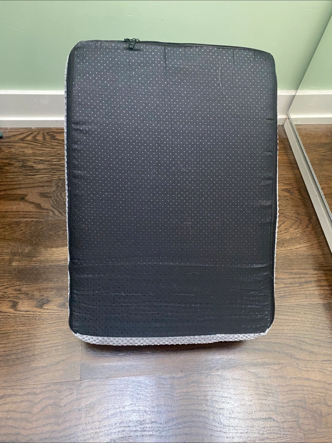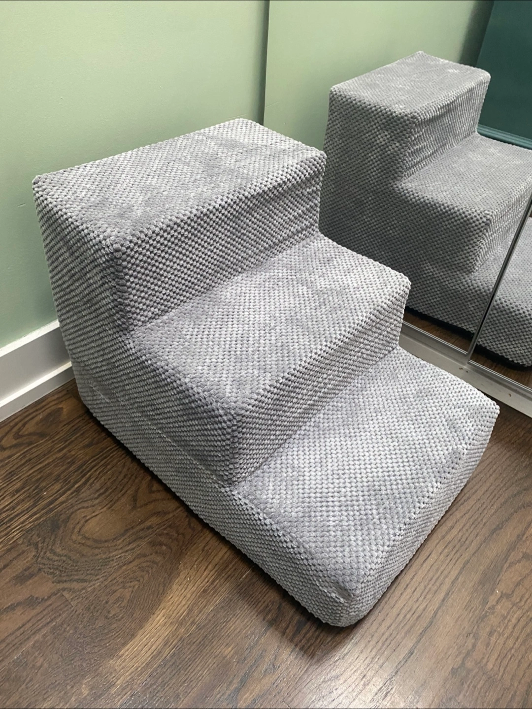 Three-step pet stairs. Grey fabric cover. Non-slip bottom. Zipper closure. Suitable for small to medium-sized dogs or cats. Only used handful of times. Like new