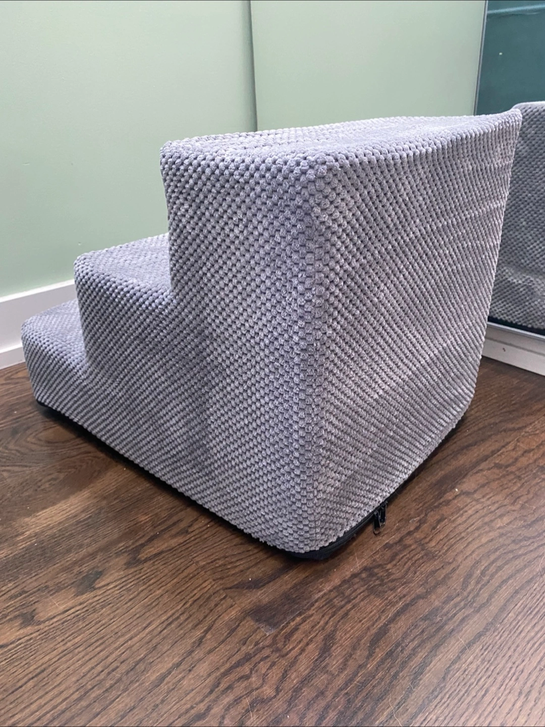 Three-step pet stairs. Grey fabric cover. Non-slip bottom. Zipper closure. Suitable for small to medium-sized dogs or cats. Only used handful of times. Like new