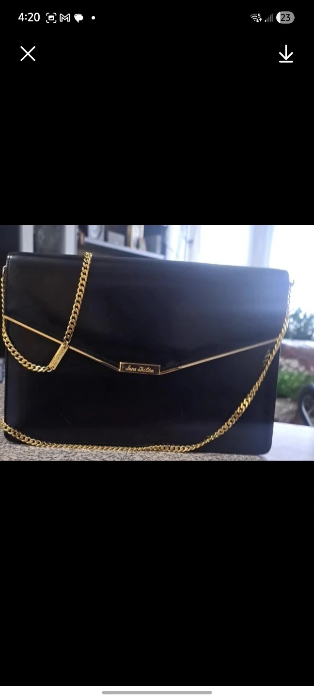 A classic black clutch purse by Jane Shilton. It features a sleek design with a gold chain strap. This elegant bag is perfect for evening wear.