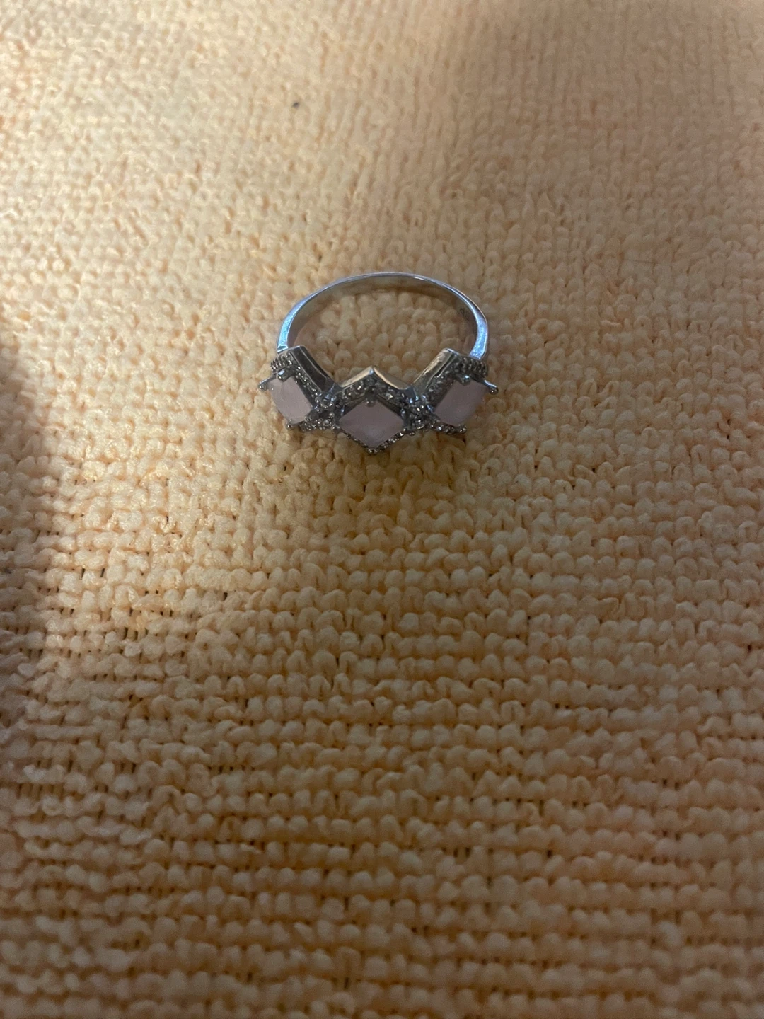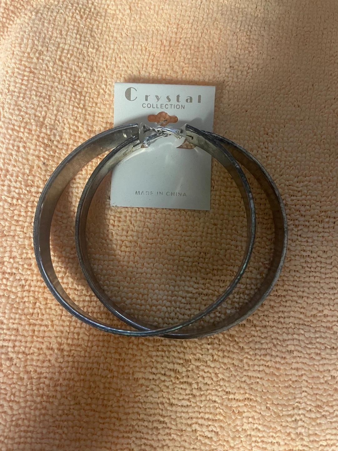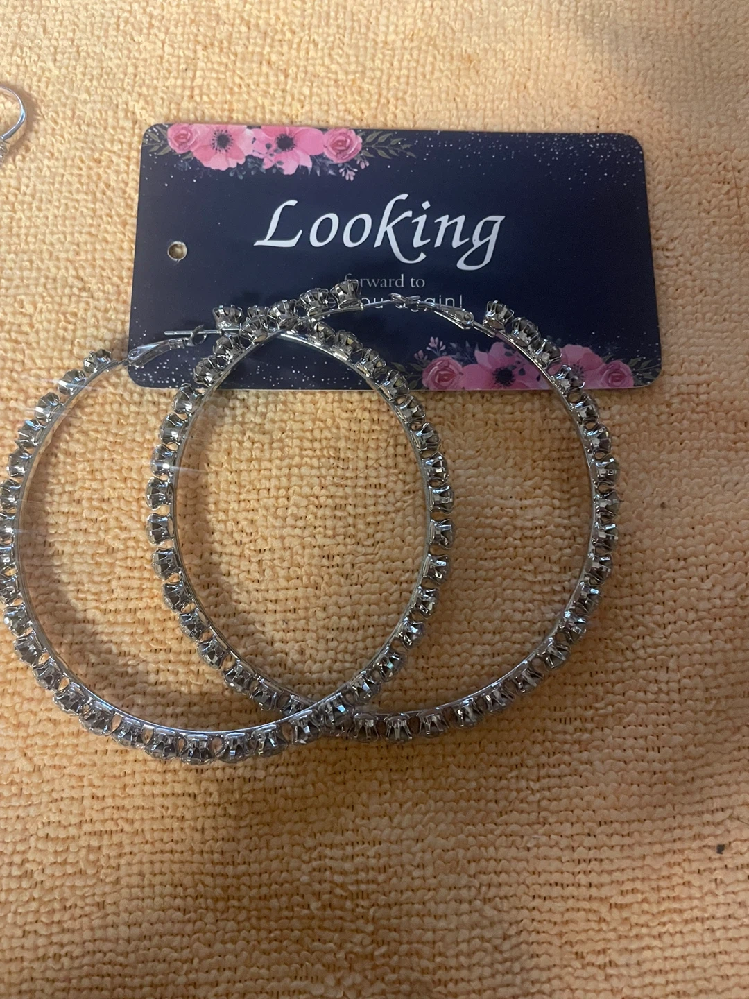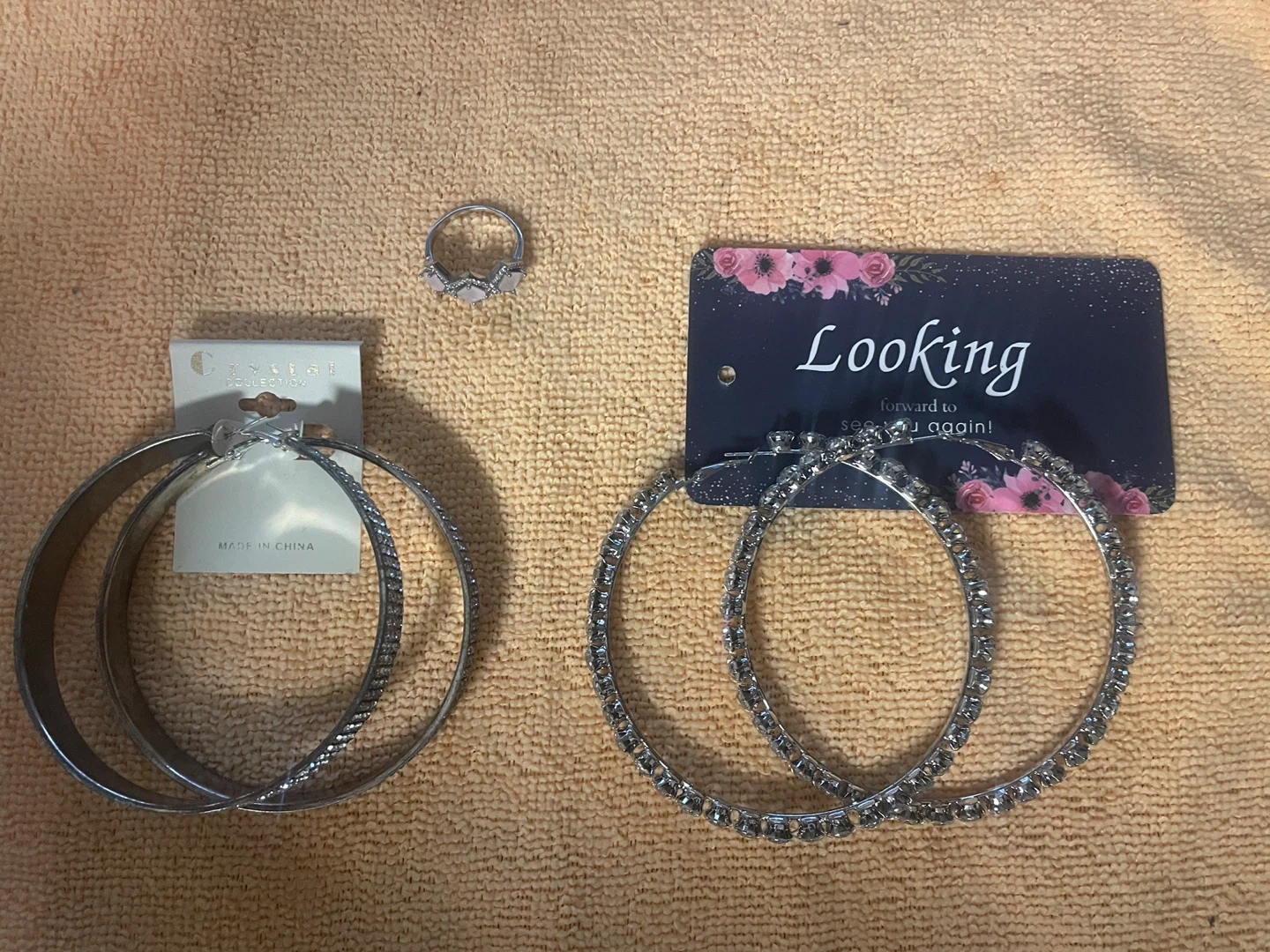 Two pairs of hoop earrings and one ring are included. One pair of hoops is plain silver-tone. The other pair of hoops is decorated with rhinestones. The ring has three square-cut stones. Made in China.
