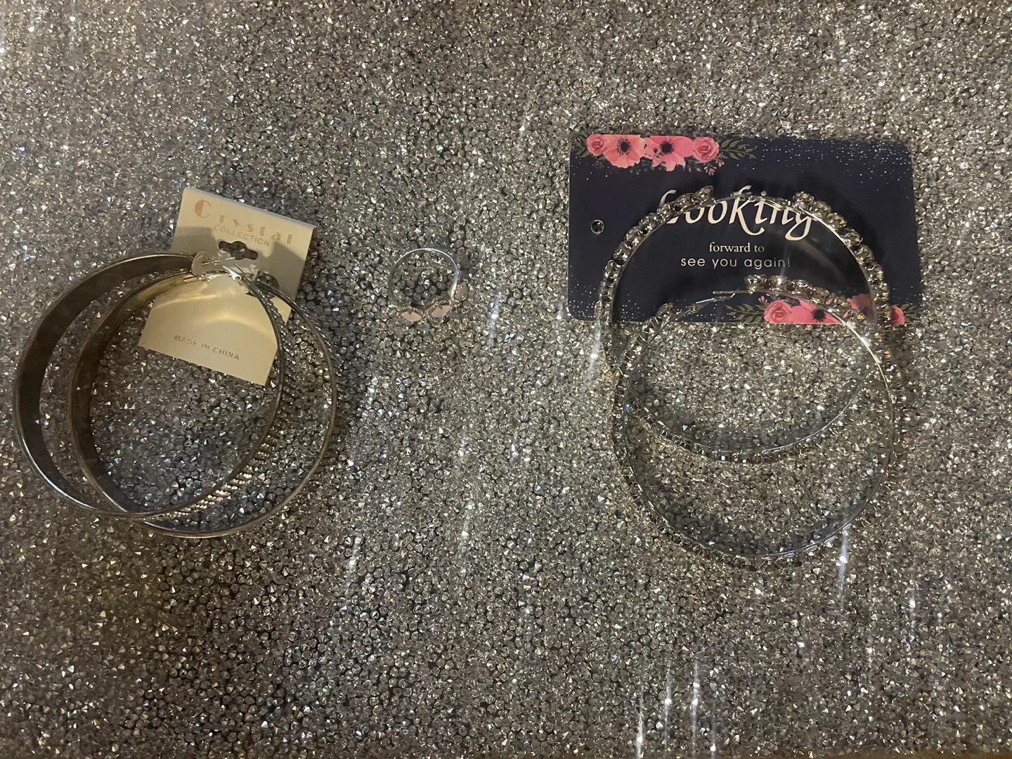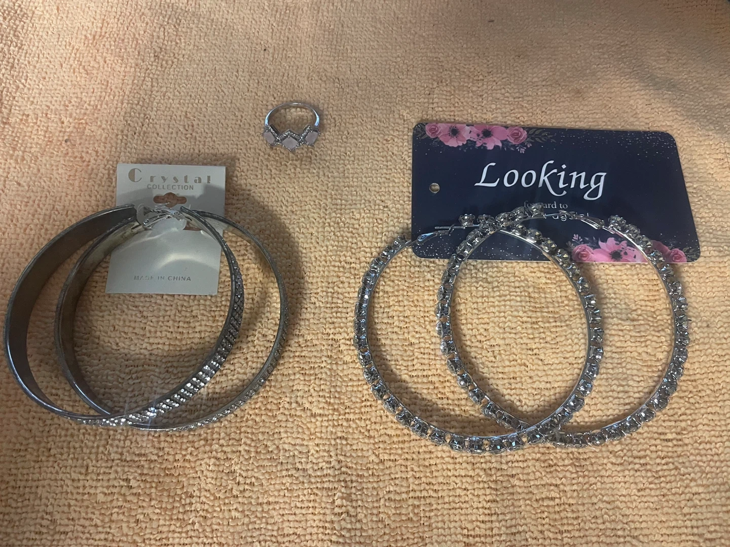 Two pairs of hoop earrings and one ring are included. One pair of hoops is plain silver-tone. The other pair of hoops is decorated with rhinestones. The ring has three square-cut stones. Made in China.