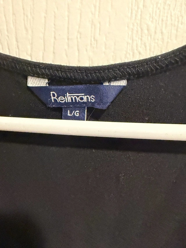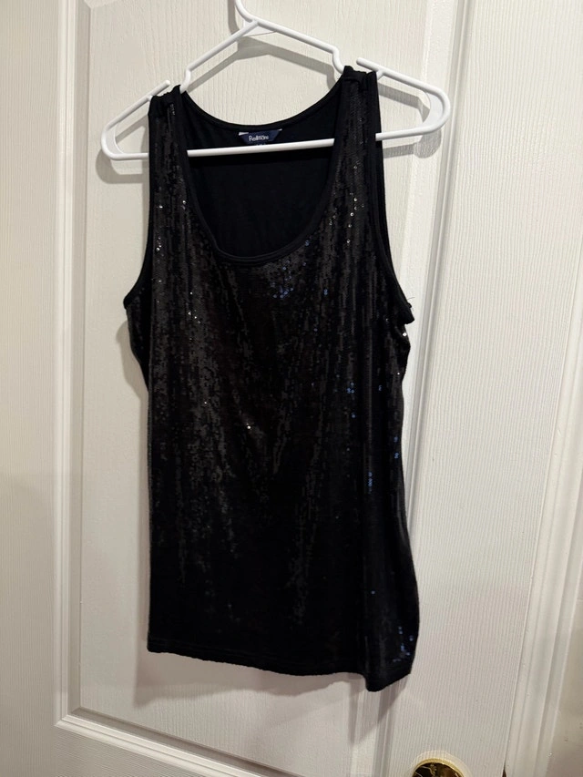 This is a Reitmans black tank top, sparkling with sequins, perfect for adding a touch of glamour to your outfit. It is in used, but good condition. Brand: Reitmans, Size: L/G, Colour: Black, Material: Sequins. Looking to spice up your wardrobe? This tank top is just waiting to find a new home! If the ad's up, it's still shimmering and ready to go!