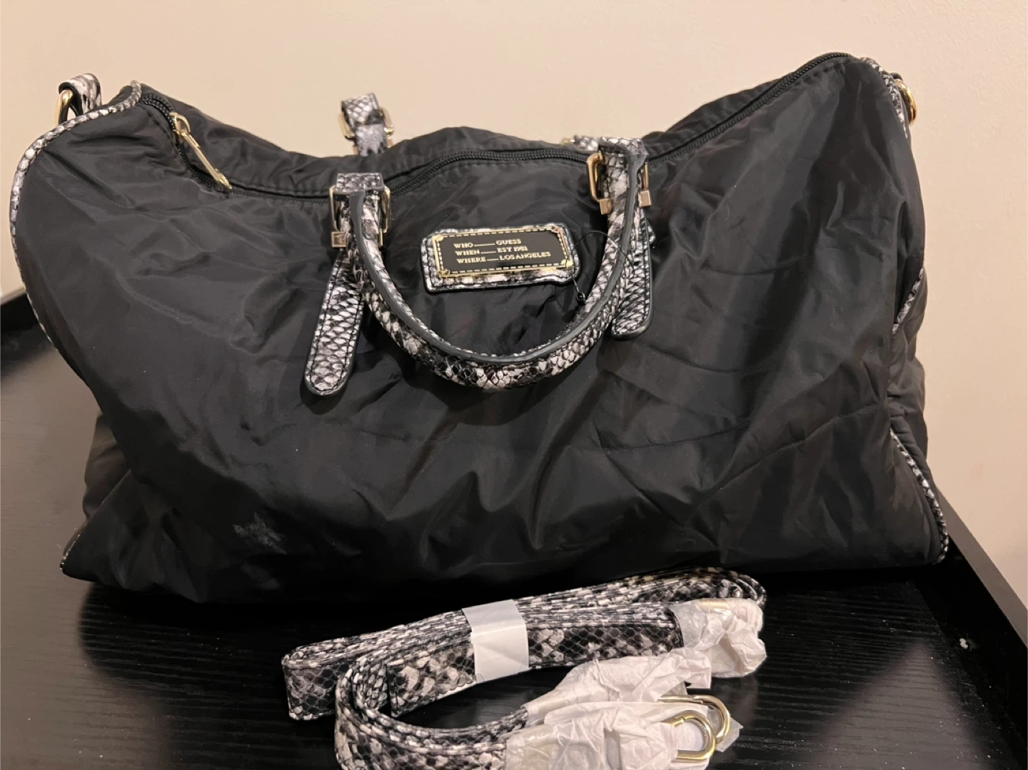 Selling a stylish black duffle bag! It features snake print accents on the handles and straps, adding a touch of flair. The bag is in great condition and comes with an additional shoulder strap. Perfect for travel or gym use!