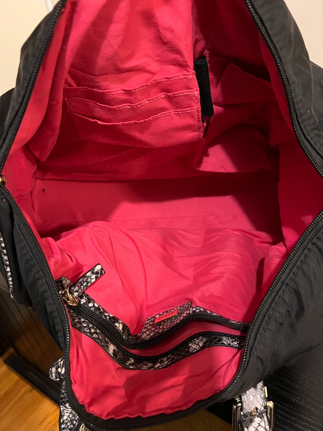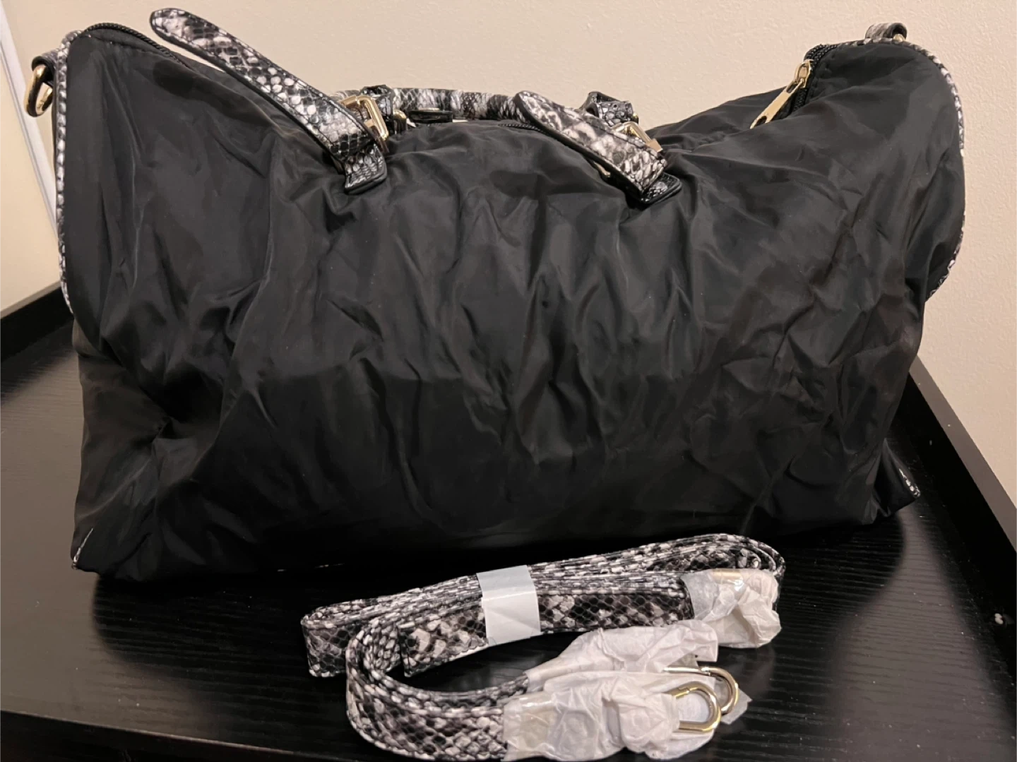 Selling a stylish black duffle bag! It features snake print accents on the handles and straps, adding a touch of flair. The bag is in great condition and comes with an additional shoulder strap. Perfect for travel or gym use!