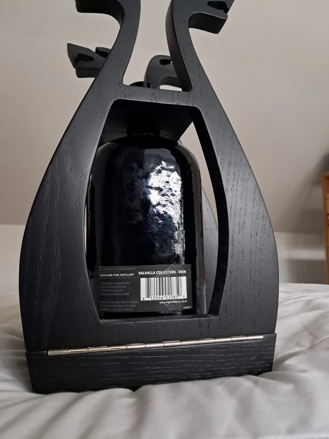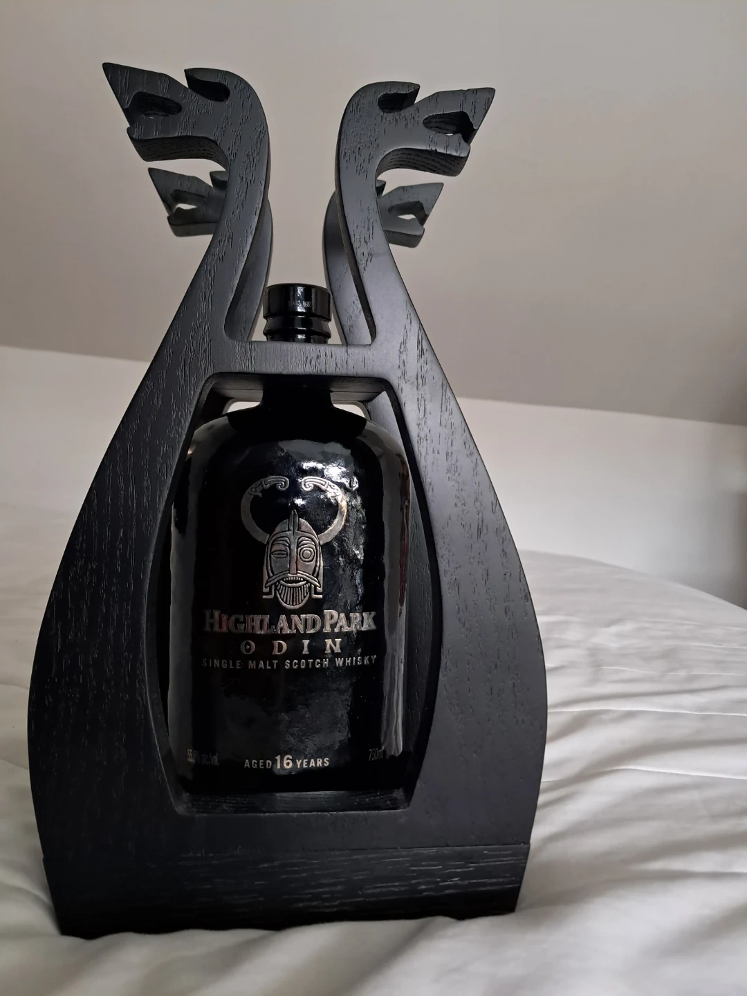 Highland Park Odin Single Malt Scotch Whisky. From the very limited Valhalla series(2012-2015) Includes wooden "longship" stand. Extremely rare showcase piece/decanter! No chips, cracks, scratches etc.