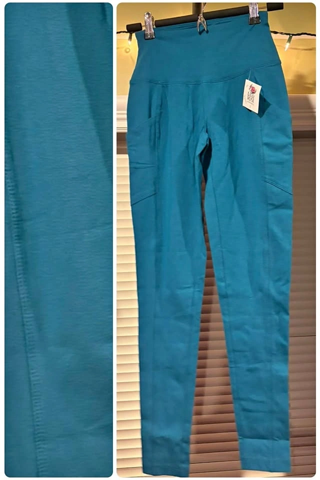 Teal athletic pants from Lily Rose Apparel. These pants feature a high waist and functional pockets. Comfortable and stylish for everyday wear. Retail $35.99. Cotton/spandex. Small. BNIP. Pet Friendly: NS. Porch pickup available in Maple Ridge/Websters.