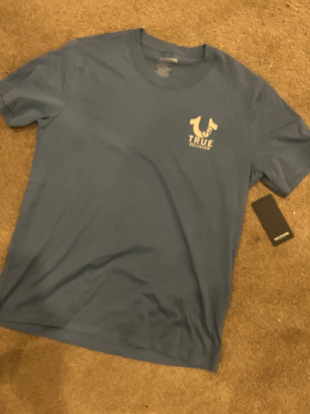 This is a brand new blue True Religion t-shirt. It features multiple brand logos and graphics on the back. Short sleeves and a crew neck. Cotton material.