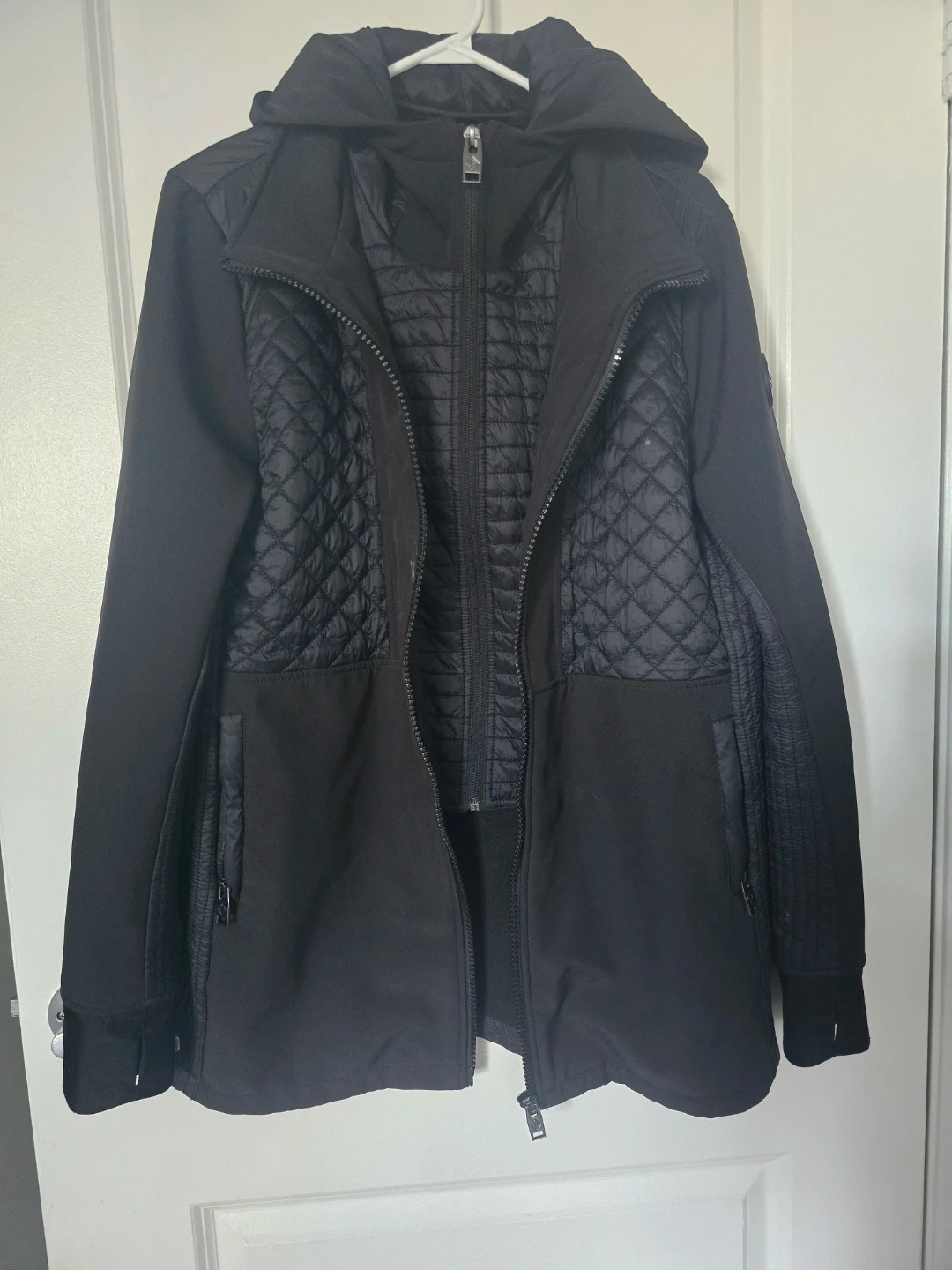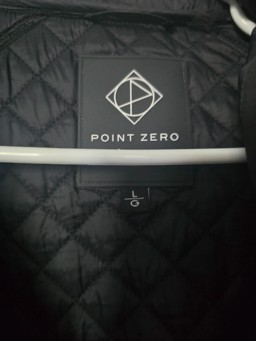Point Zero hooded jacket in black, featuring a quilted design. It's a size Large. This jacket is great for transitional weather!