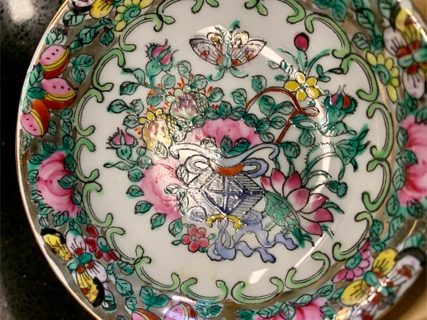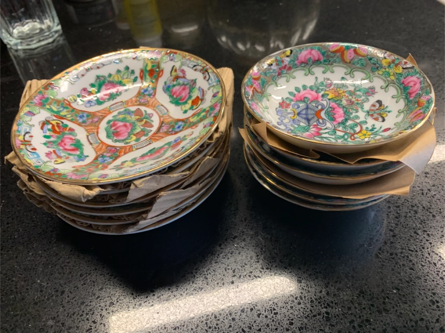 Includes 2 set of 6 saucers featuring the classic Rose Medallion pattern. Hand-painted decoration and gold trim. Made in China. Perfect for serving tea or as decorative pieces.