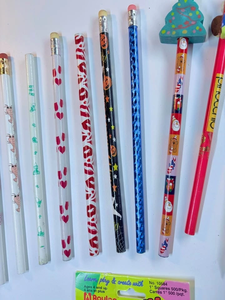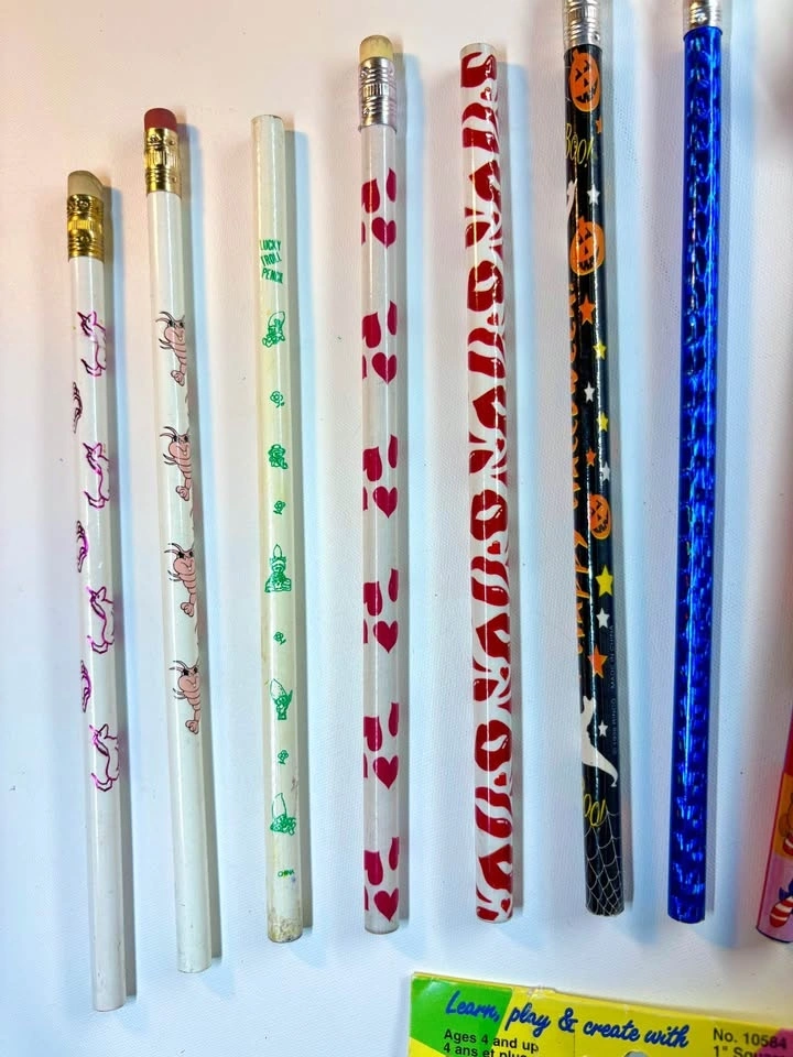 Also available are a Halloween pencil, Troll pencil, Bubba Gump Shrimp pencil, Lips pencil, Hearts pencil, Unicorn pencil, and a blue sparkly pencil.