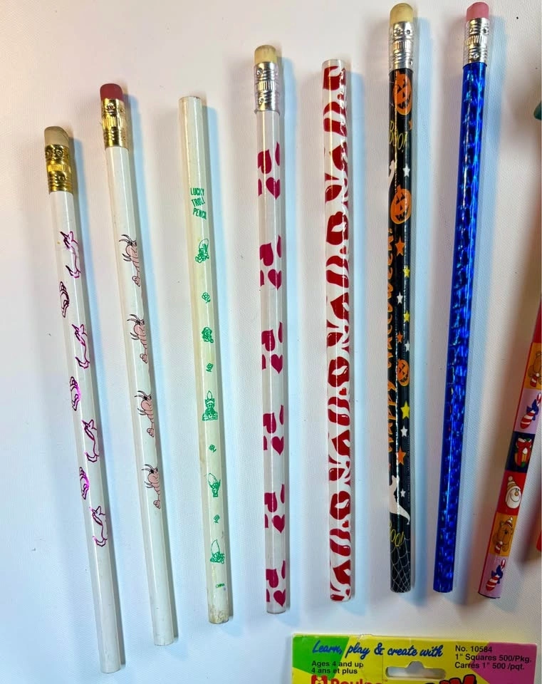 Also available are a Halloween pencil, Troll pencil, Bubba Gump Shrimp pencil, Lips pencil, Hearts pencil, Unicorn pencil, and a blue sparkly pencil.