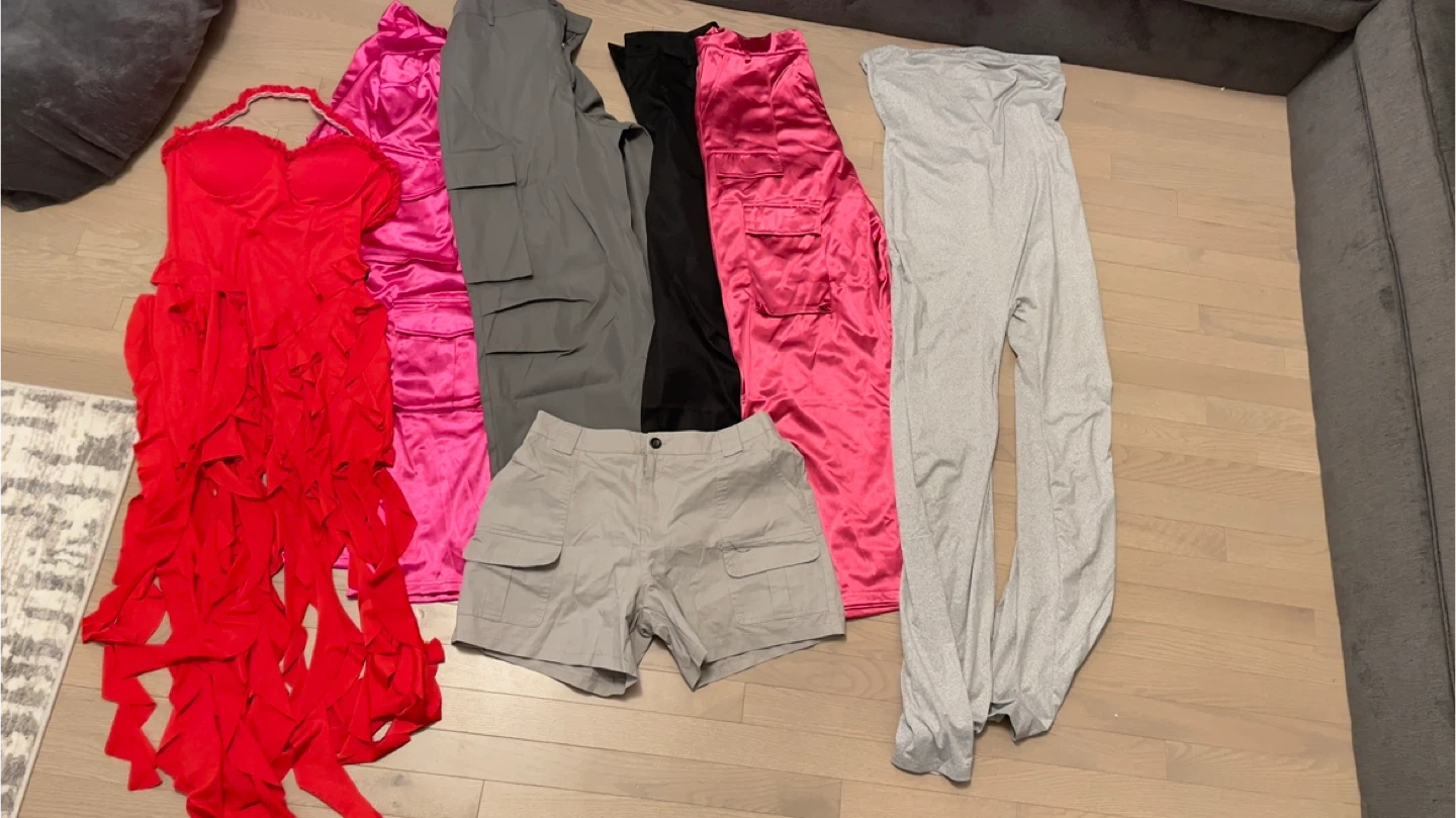 Stylish clothing bundle up for grabs! Got some pink satin cargo pants, grey cargo pants, black satin pants, and grey cargo shorts. Also a pretty red ruffled dress/top and comfy light grey tube top onesie. All new. Size Large and XL