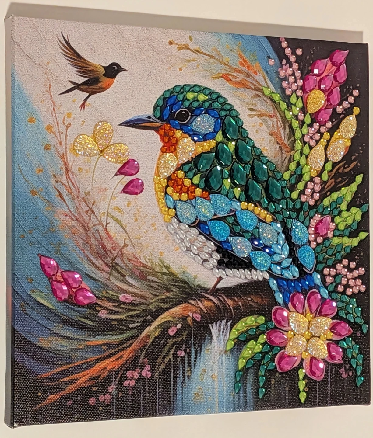 Selling a lovely bird rhinestone painting! This piece features a colourful bird design made with sparkling rhinestones, set against a painted canvas background. It's a unique and eye-catching piece of art that would brighten up any room