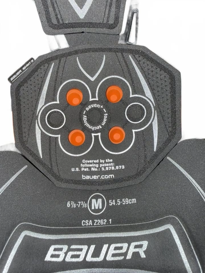 Bauer ice hockey helmet in black featuring a sturdy cage face mask for full facial protection. Adjustable straps ensure a secure fit. Interior padding provides comfort and impact absorption. Size Medium (54.5-59 cm).