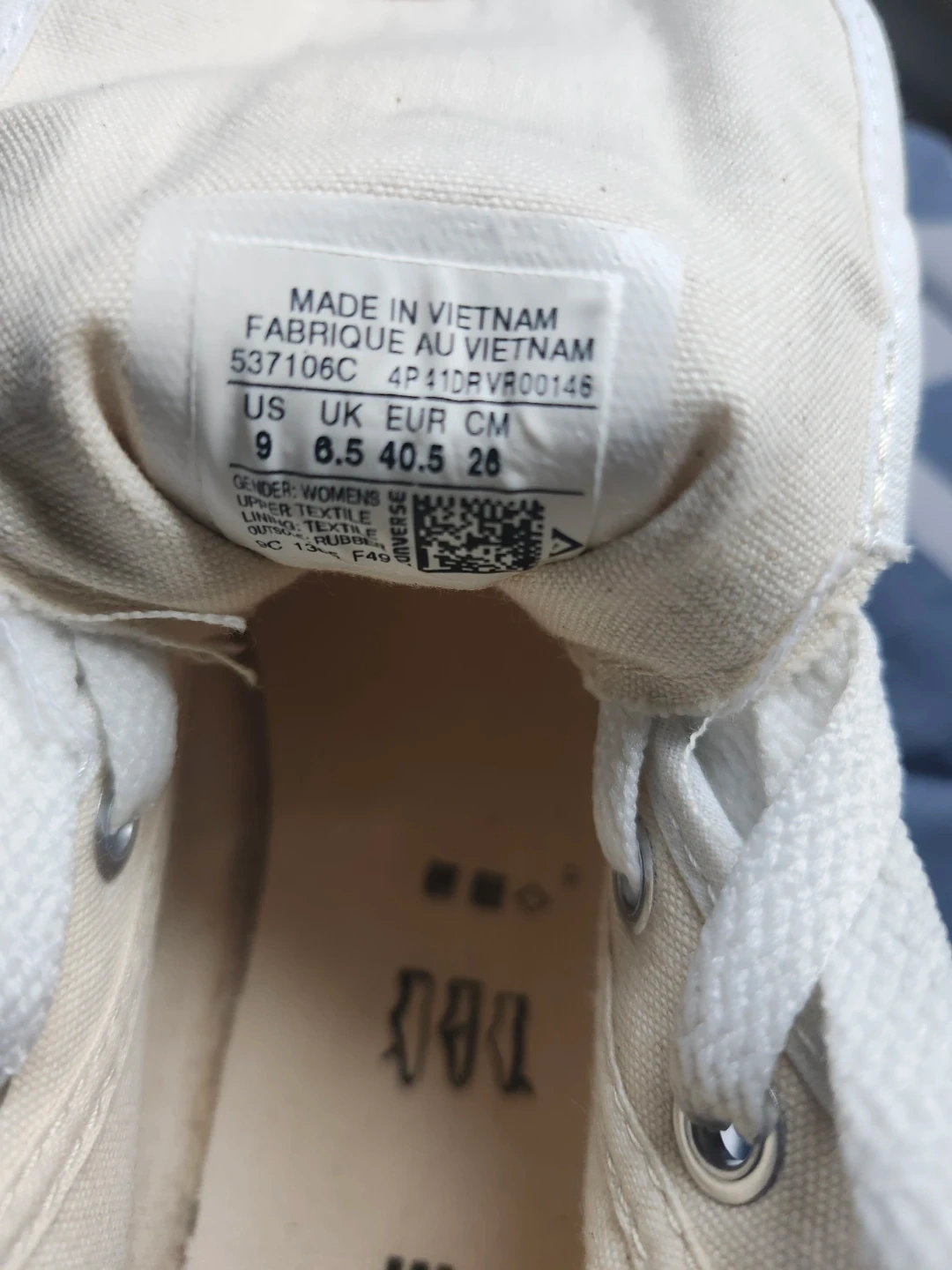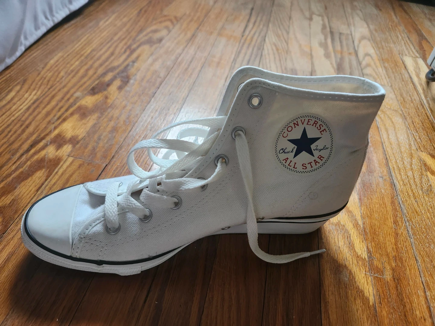 Classic white Converse Chuck Taylor All Star high top sneakers. Canvas upper and rubber sole. Women's US size 9. Made in Vietnam.