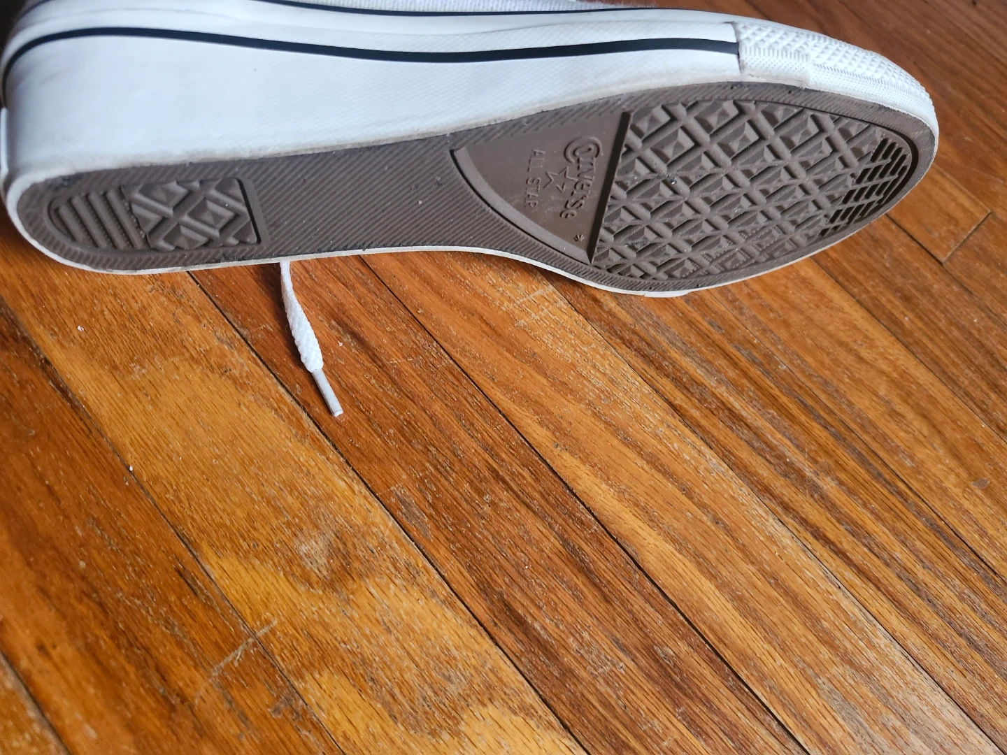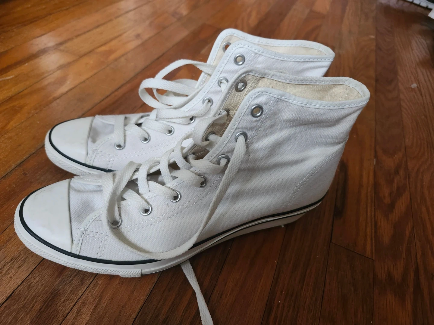 Classic white Converse Chuck Taylor All Star high top sneakers. Canvas upper and rubber sole. Women's US size 9. Made in Vietnam.