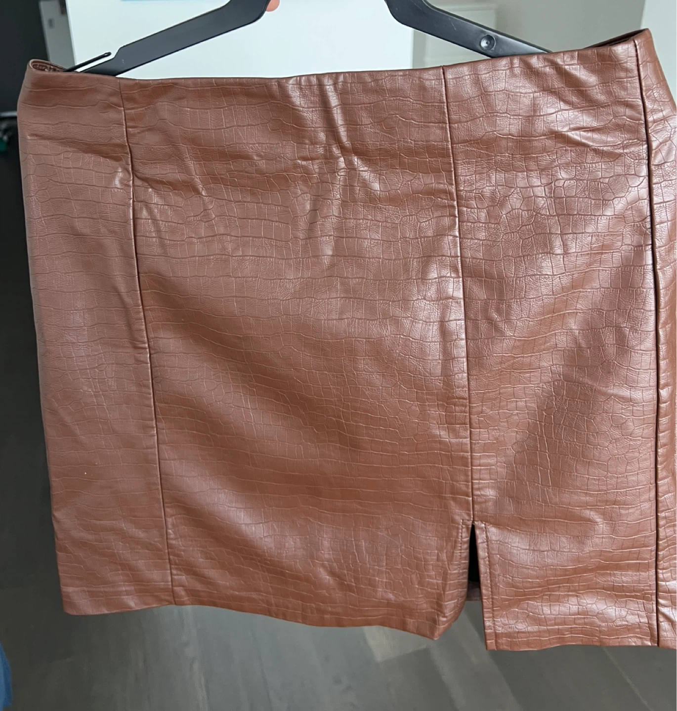Crocodile-embossed faux leather mini skirt. Brown colour. Features a side slit. Great condition - never worn