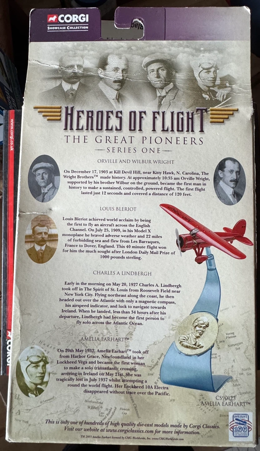 This Corgi Showcase Collection features a diecast model of the Wright Brothers' aircraft. It includes a medal of achievement and historical information about early aviation pioneers. This collectible is part of the 'Heroes of Flight' series.