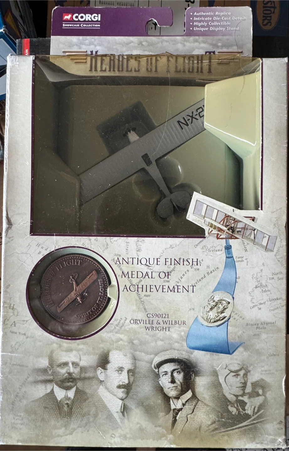 This Corgi Showcase Collection features a diecast model of the Wright Brothers' aircraft. It includes a medal of achievement and historical information about early aviation pioneers. This collectible is part of the 'Heroes of Flight' series.