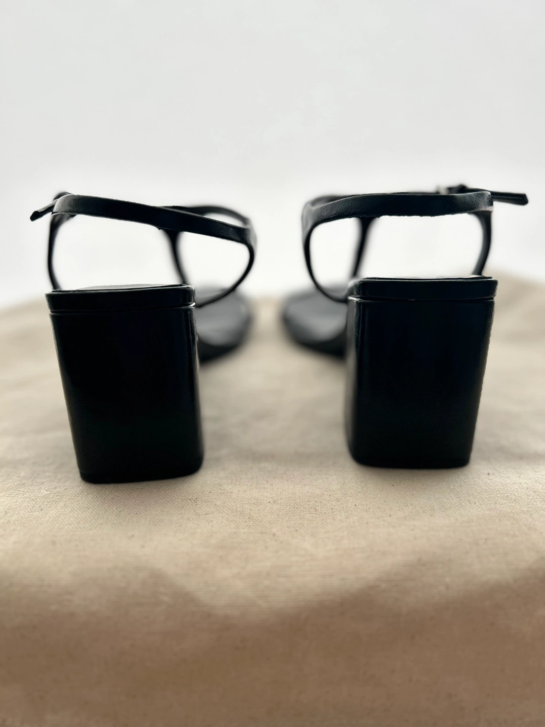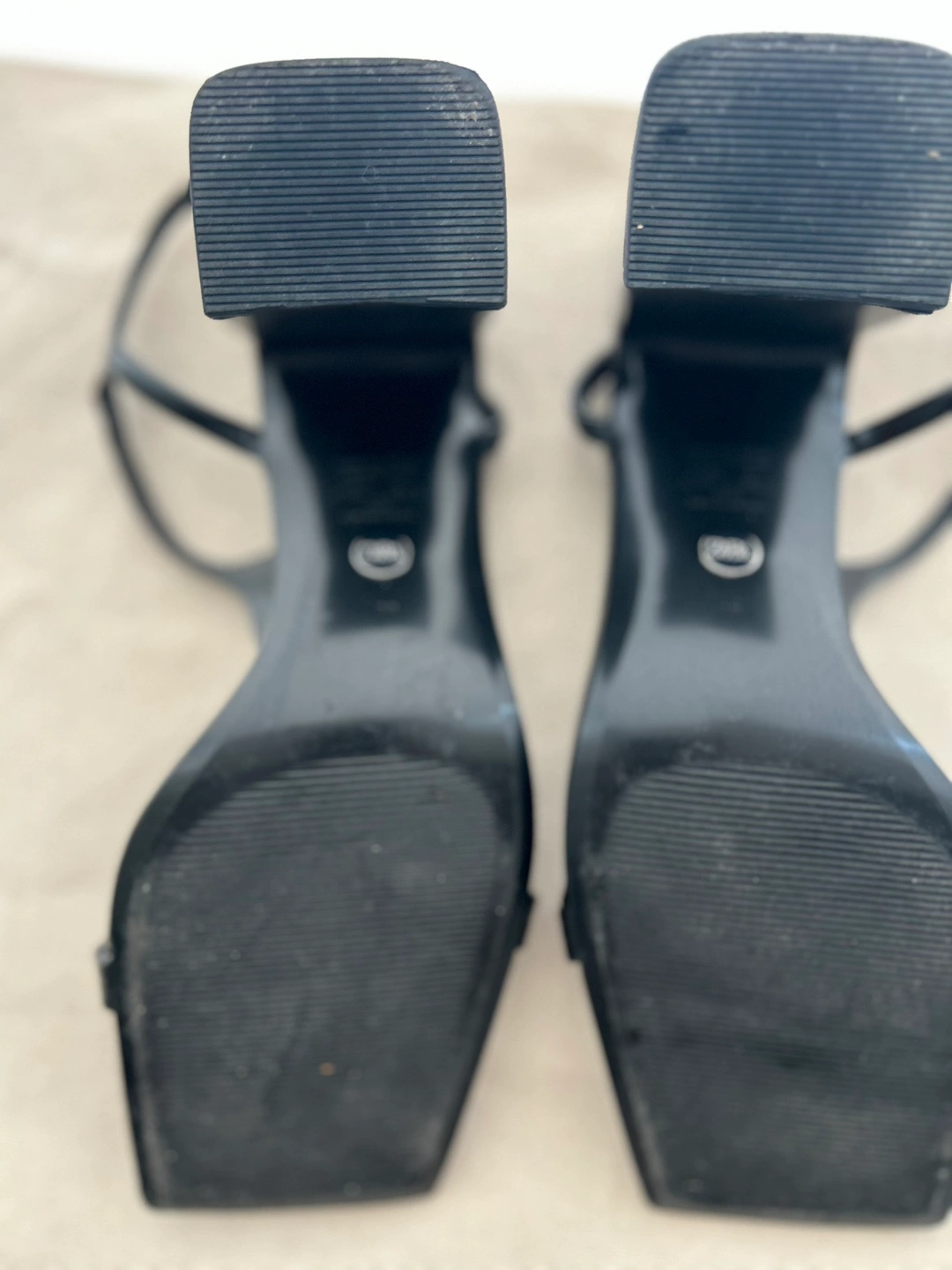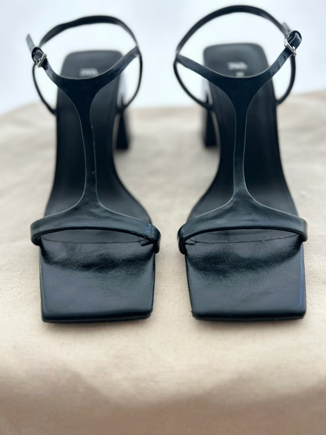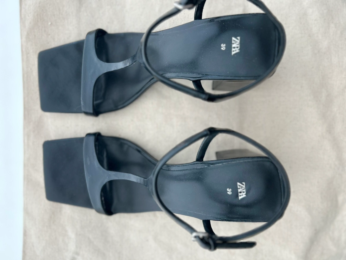 Size 39, Faux patent leather black heels with square toe and ankle strap.