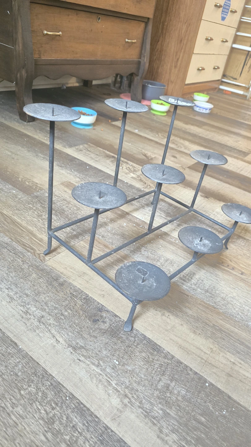 This metal stand holds up to 9 taper candles. It's made of dark grey metal and has a tiered design. Perfect for creating a warm ambiance on a table or mantelpiece!
