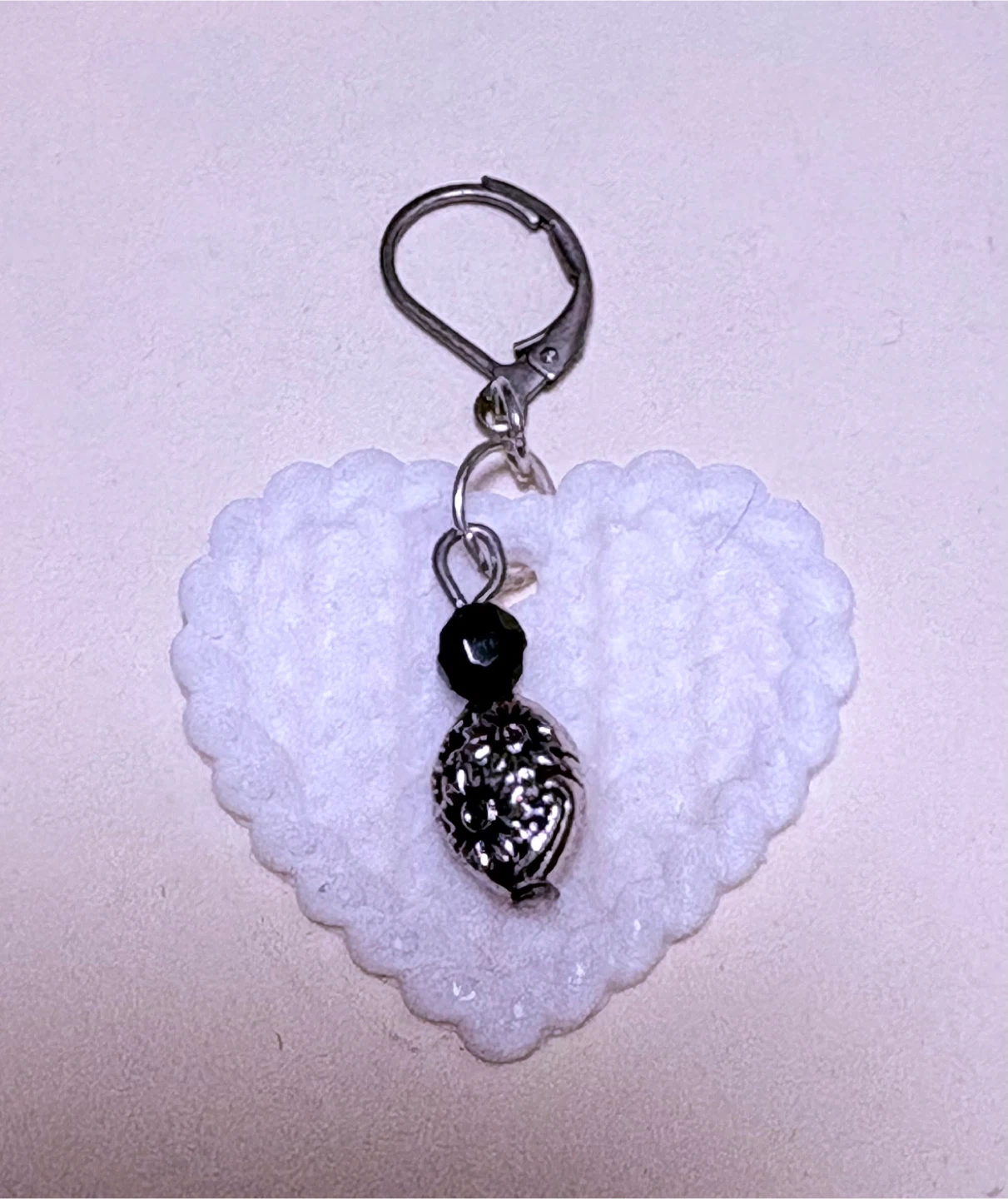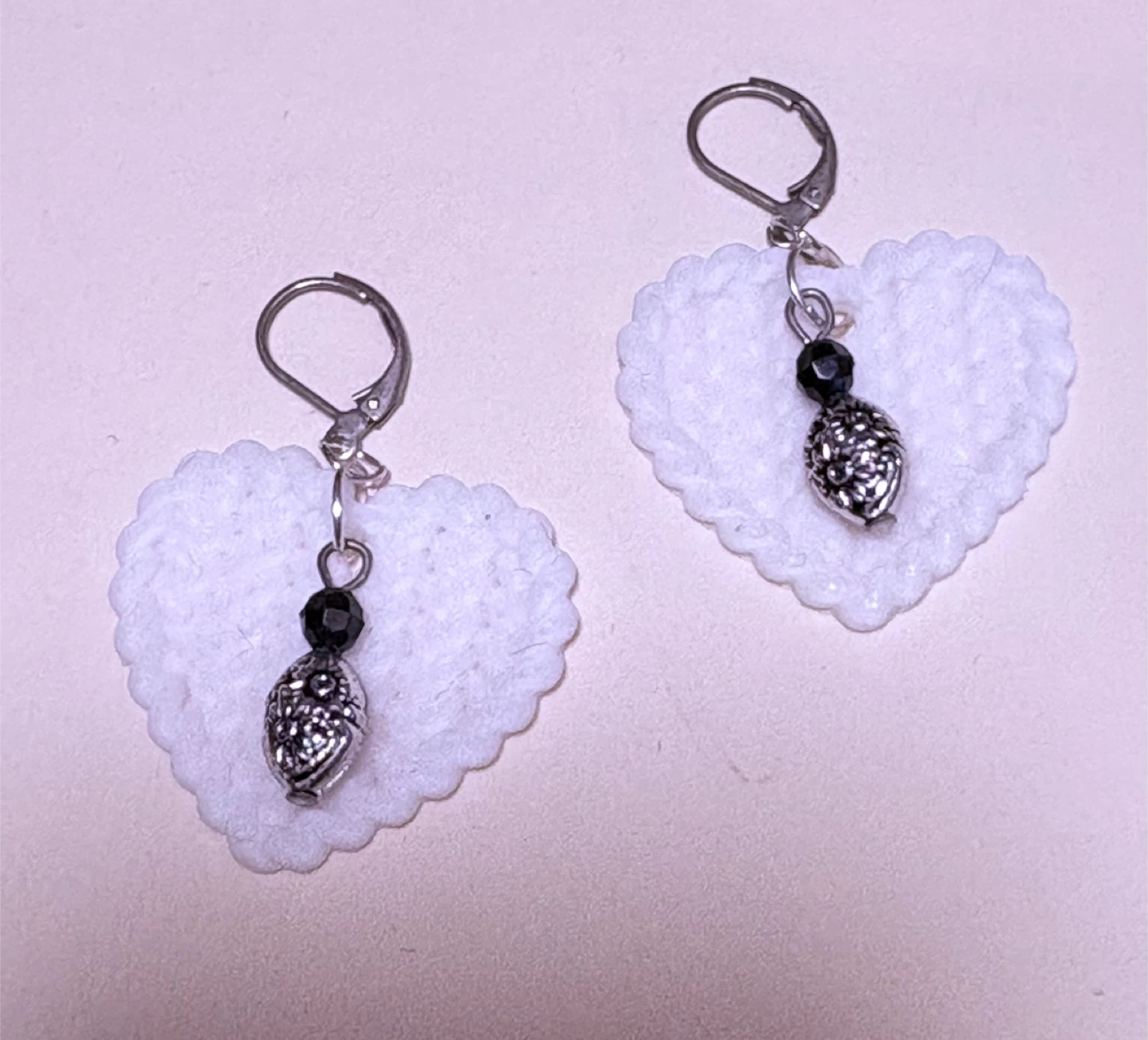 These dangle earrings feature white heart-shaped charms with silver-tone accents. Each earring has a black bead above a decorative silver charm. They're secured with leverback ear wires.