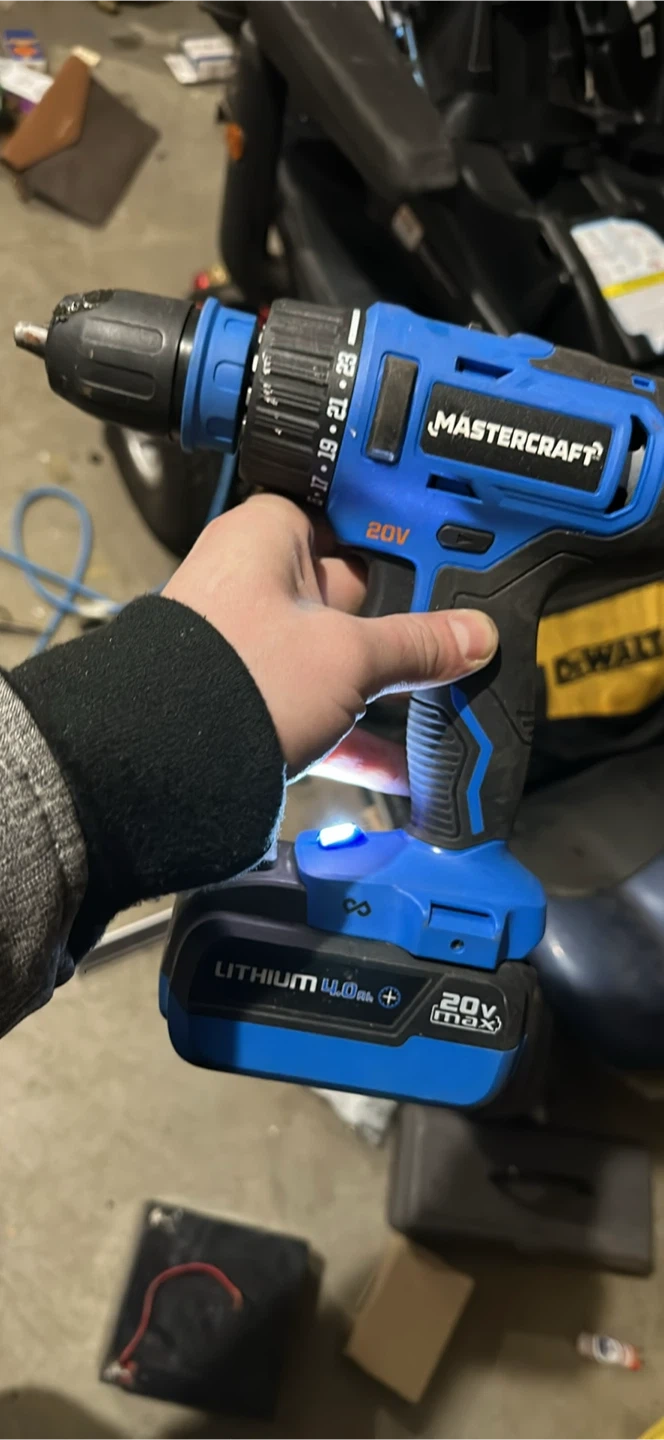 This is a Mastercraft 20V cordless drill with a 4.0Ah lithium battery. It features a variable speed trigger and a chuck for easy bit changes. Great for DIY projects!