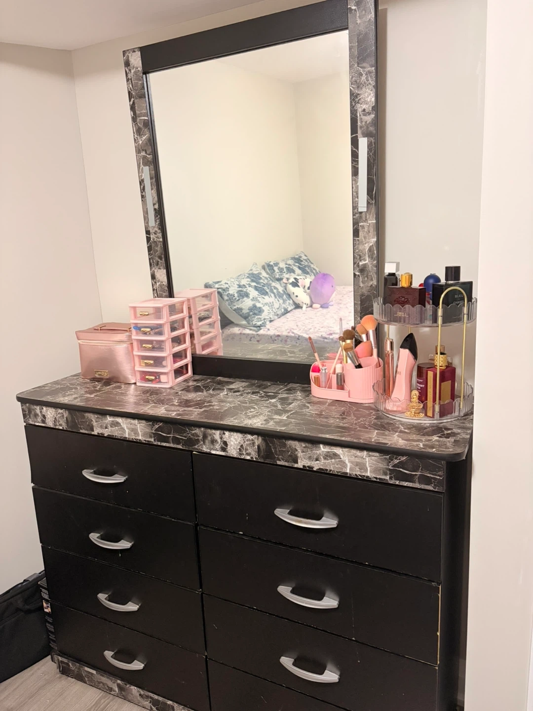 This dresser has a black finish with a marble-look top and mirror. It features six drawers for storage. Perfect for organizing your bedroom essentials!
