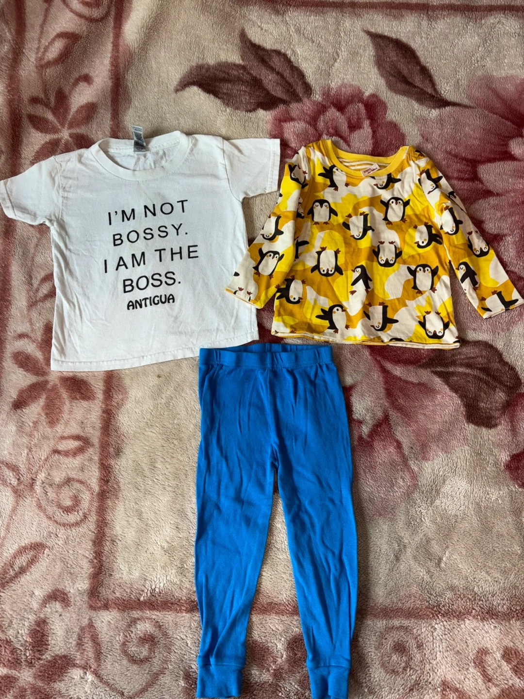 Set includes a yellow long-sleeve shirt with a penguin print and a white short-sleeve tee with 'I'm Not Bossy, I Am The Boss' graphic. Also includes a pair of blue leggings. Outfit's perfect for any little one.