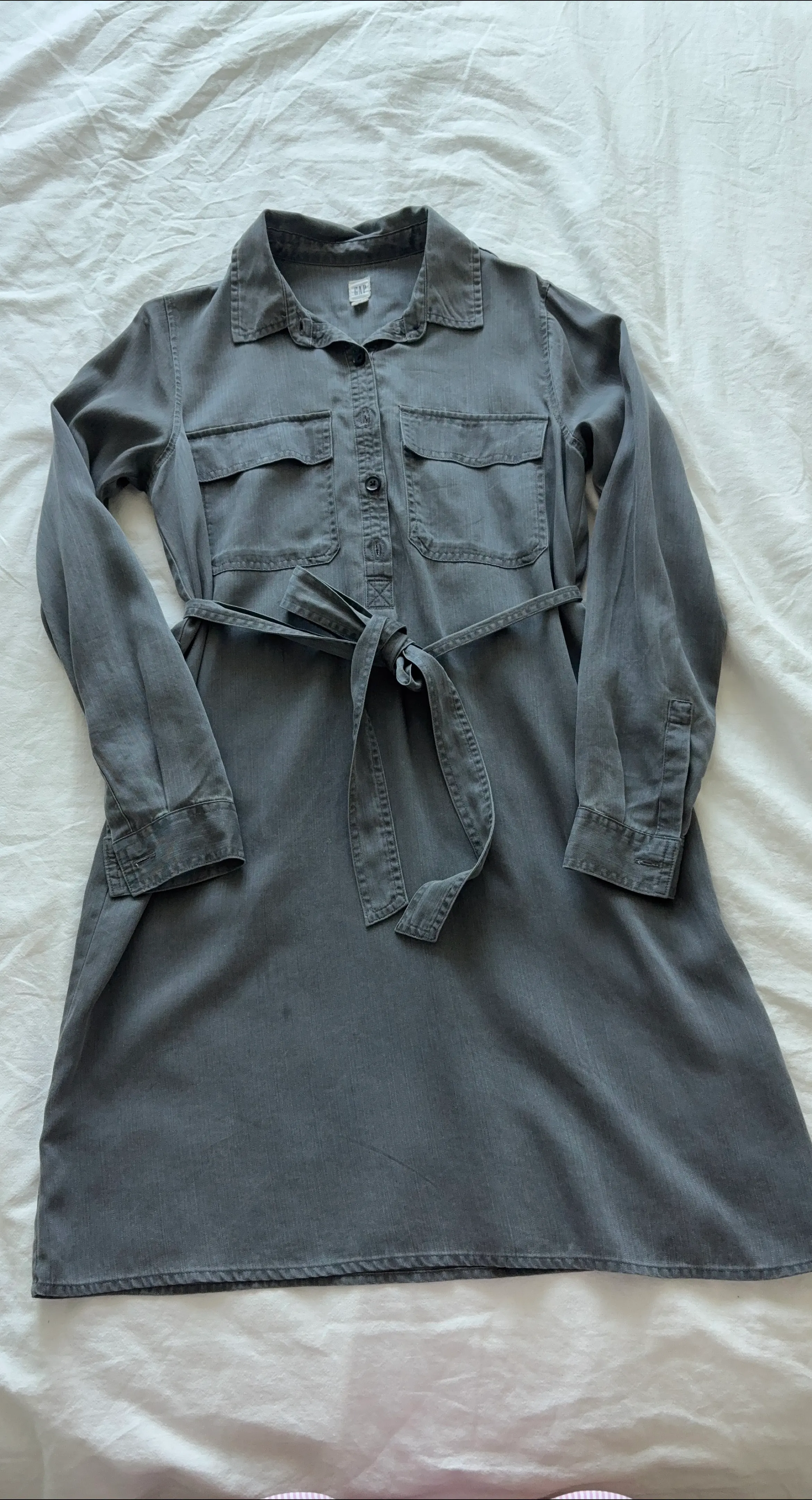 A cute grey denim shirt dress from GAP! It has a tie at the waist and two pockets on the chest. It's in great condition and ready for a new home.