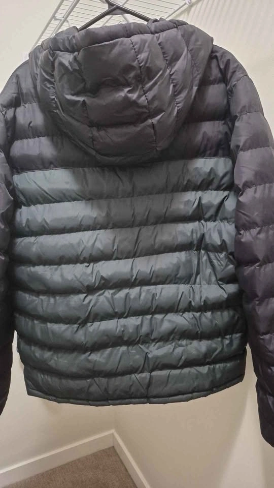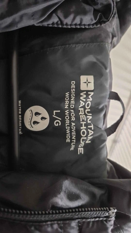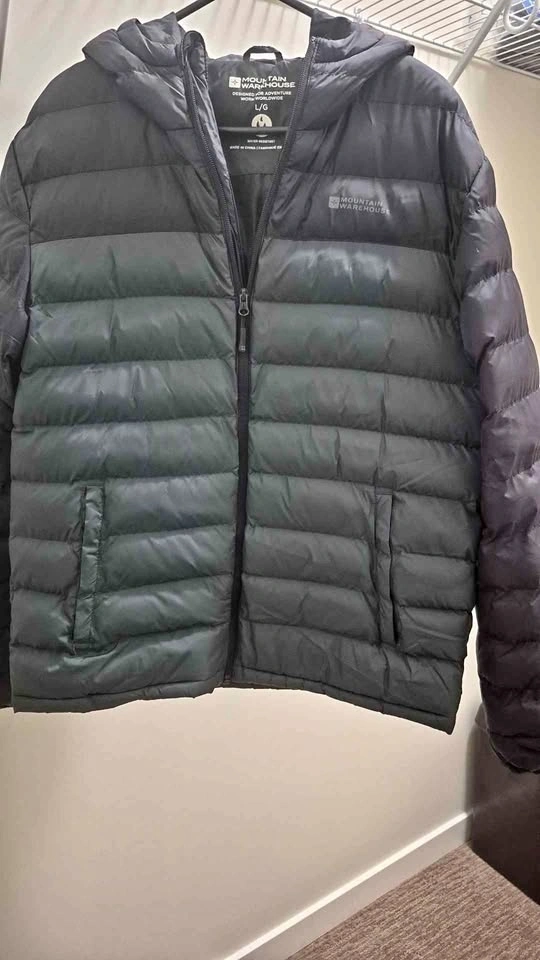 Mountain Warehouse men's padded jacket. Size LG. Water resistant, fixed hood, two side pockets, lightweight and easy to pack for travel. Excellent condition.