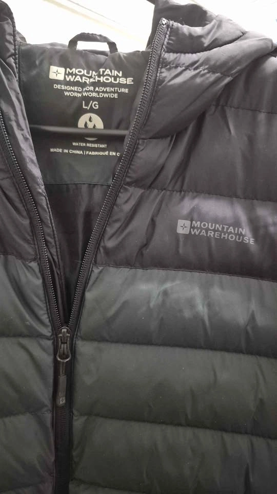 Mountain Warehouse men's padded jacket. Size LG. Water resistant, fixed hood, two side pockets, lightweight and easy to pack for travel. Excellent condition.