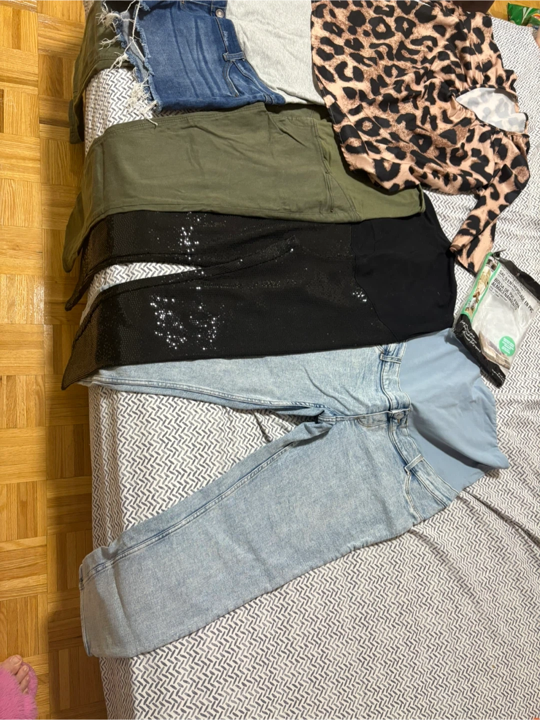 A bundle including Thyme Maternity leggings and H&M maternity jeans. Also includes a leopard print top and a black sequin skirt. Great for expectant mothers or those looking for comfy basics! M size