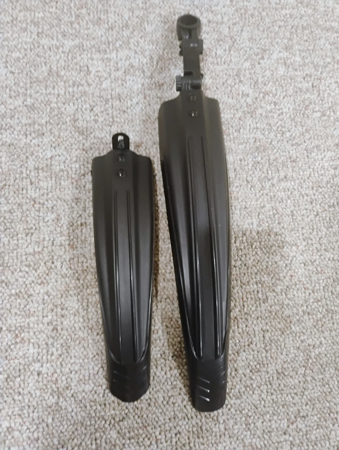 This is a set of two bicycle fenders, one larger and one smaller. They're made of black plastic and include mounting hardware. These fenders help keep you clean by blocking mud and water spray.