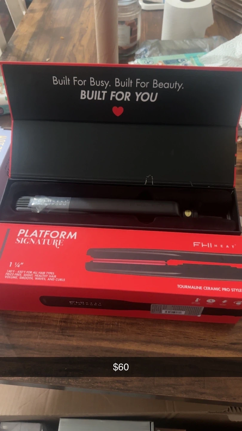FHI Heat Platform Signature flat iron. It's a 1 1/4" tourmaline ceramic pro style. Reaches 140-450°F for all hair types.