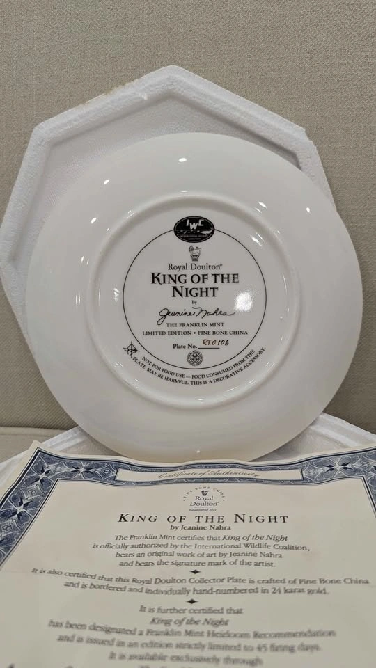 This is a Royal Doulton King of the Night collector plate from The Hamilton Collection. The plate features an African lion design from original art by Jeanine Nahra, who also signed each plate. It is a limited edition item made of porcelain with an 8-inch diameter and is bordered with 22-carat gold. The plate comes with a certificate of authenticity and is individually hand-numbered.