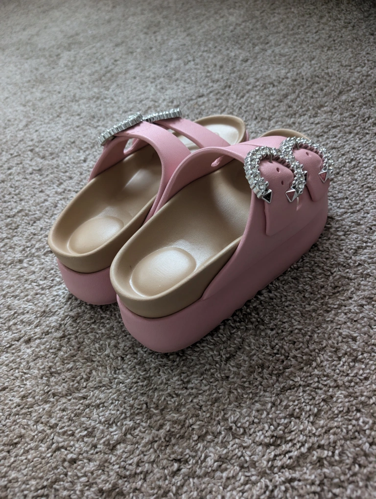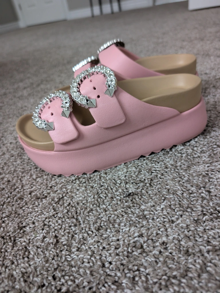 These are a pair of adorable pink platform sandals. They feature eye-catching rhinestone buckles that add a touch of sparkle. Perfect for adding a bit of height and style to your summer outfits!