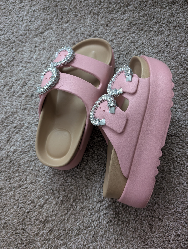 These are a pair of adorable pink platform sandals. They feature eye-catching rhinestone buckles that add a touch of sparkle. Perfect for adding a bit of height and style to your summer outfits!