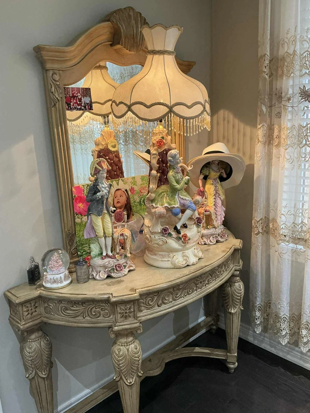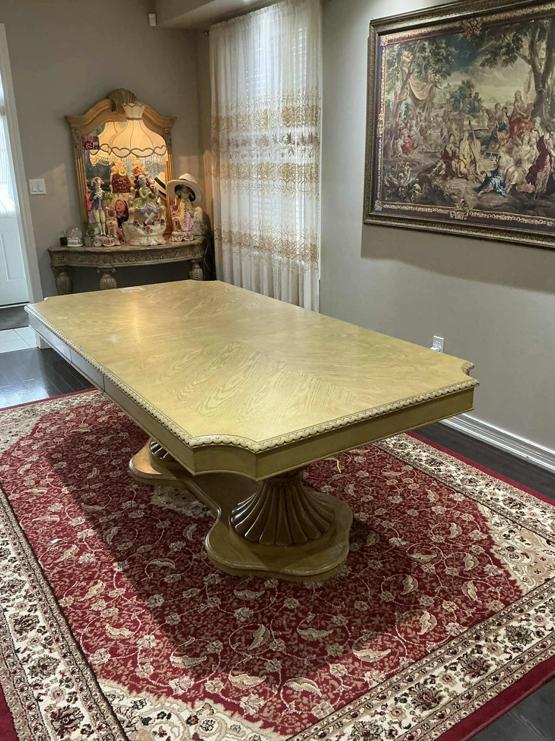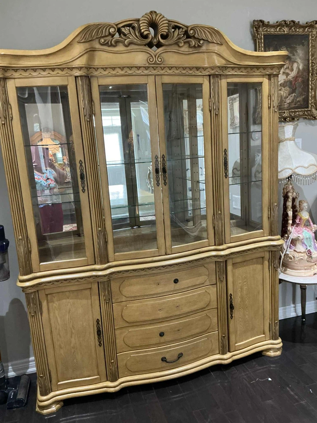 Beautiful wooden china cabinet with glass doors and ornate detailing. It features multiple shelves and drawers for storage. Perfect for displaying your fine china and collectibles!
