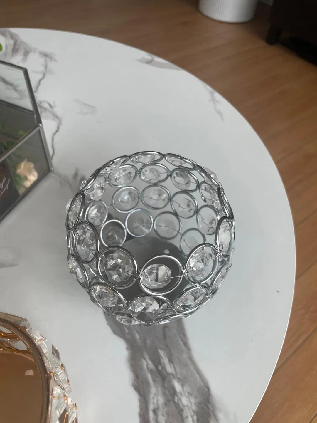 A sparkly candle holder, perfect for adding a touch of glamour to your space! It's made with a silver metal frame and clear crystal-like accents. This holder can house a tea light or a small pillar candle.