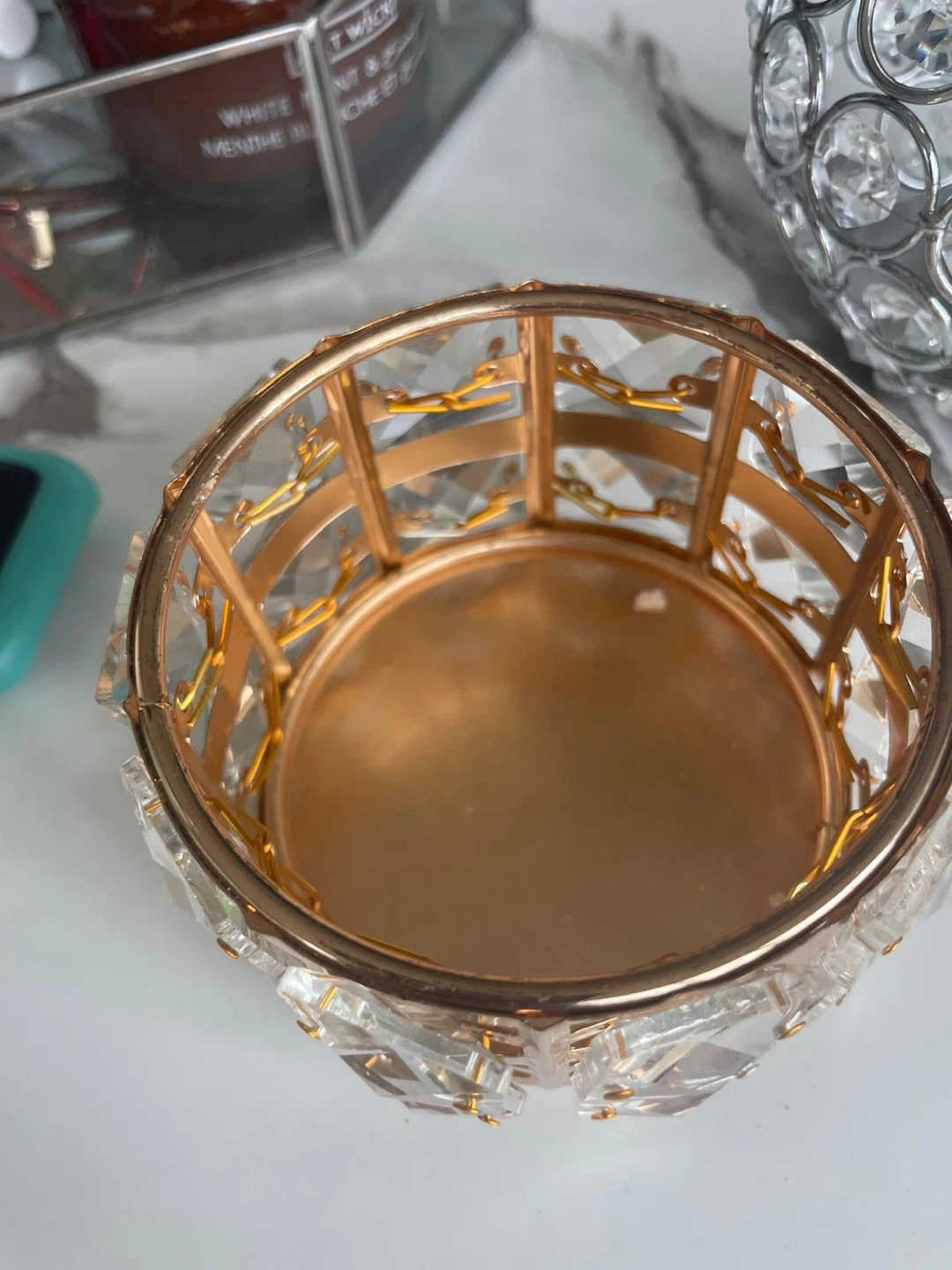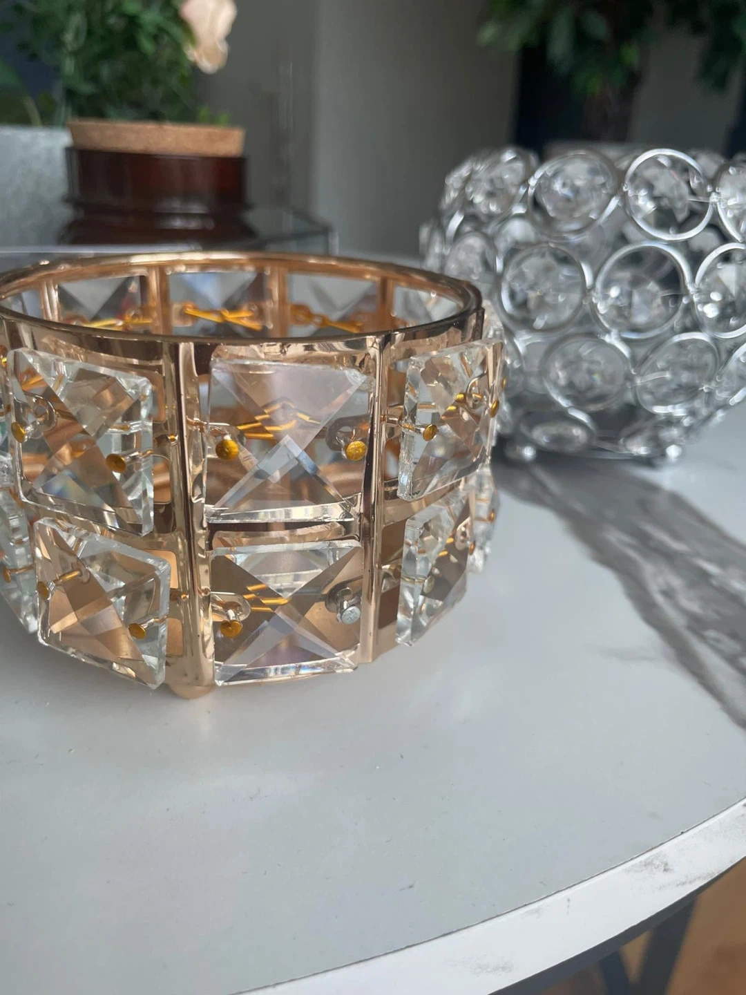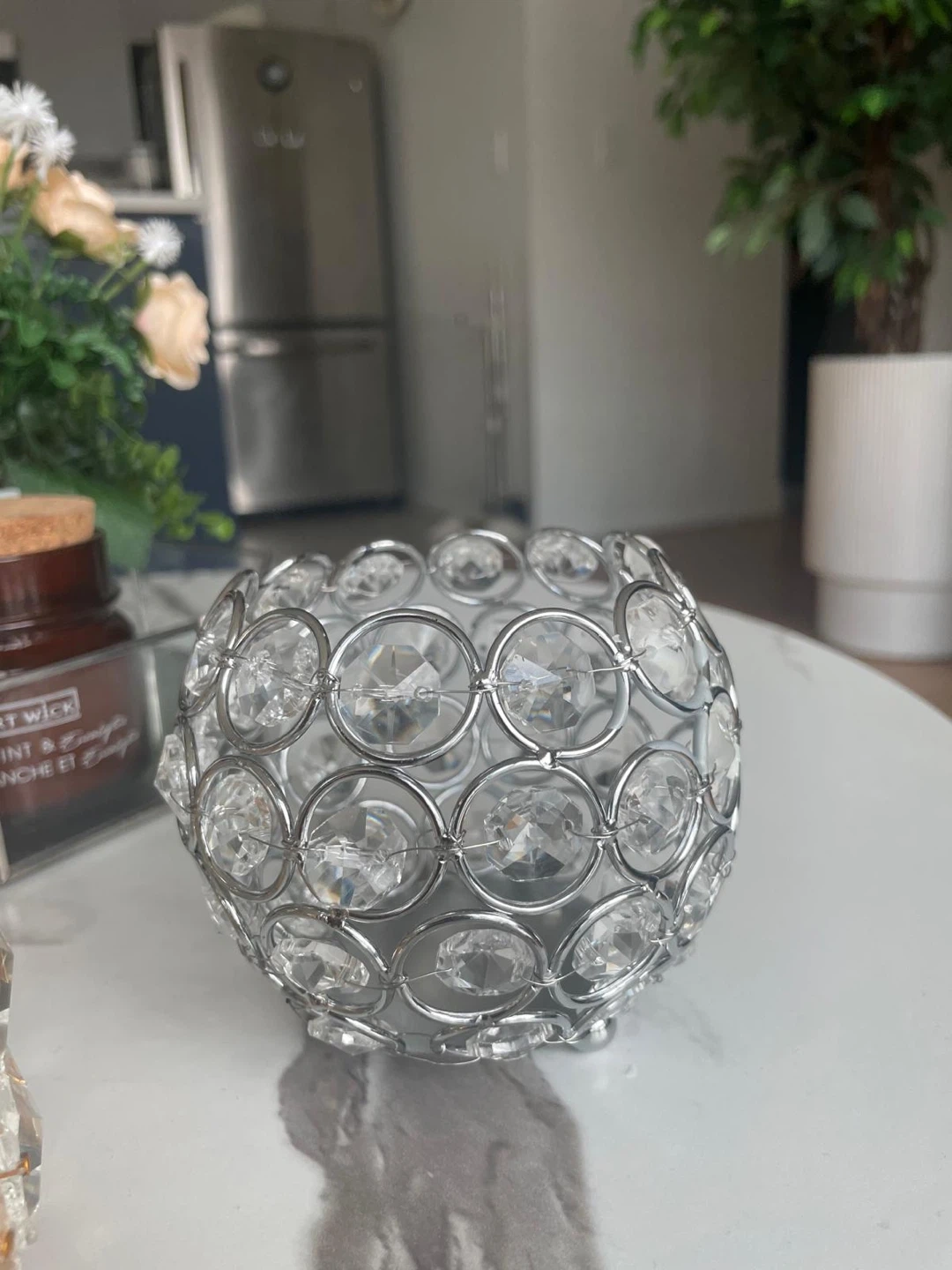 A sparkly candle holder, perfect for adding a touch of glamour to your space! It's made with a silver metal frame and clear crystal-like accents. This holder can house a tea light or a small pillar candle.