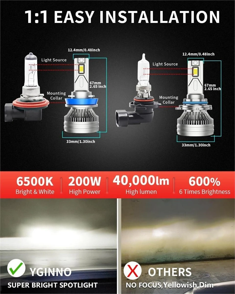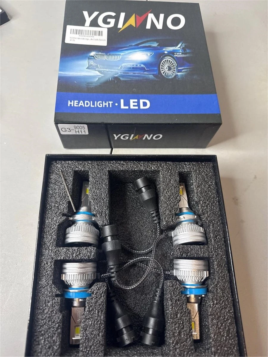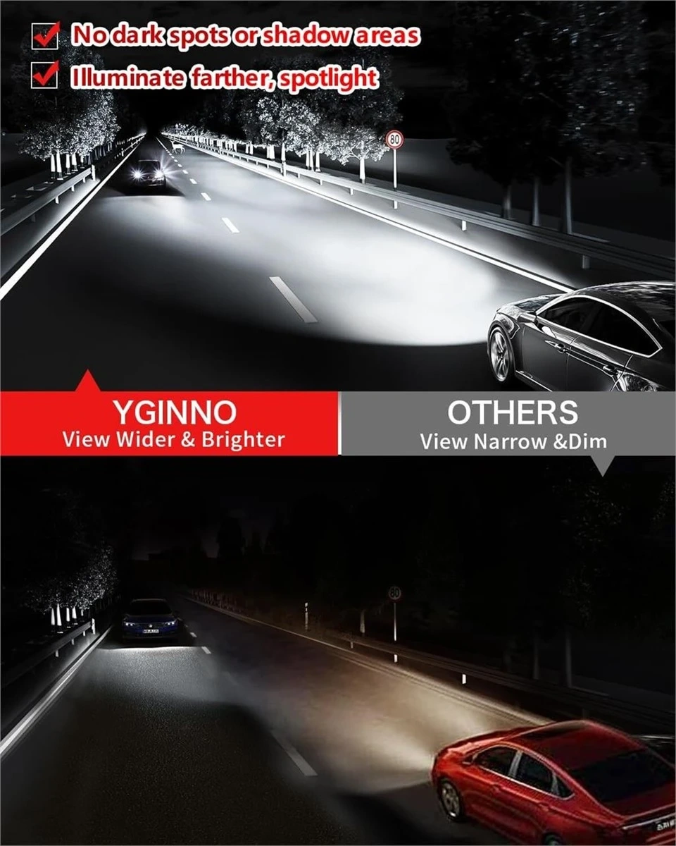 Set of two YGINNO LED headlight bulbs for vehicles. These bulbs provide 6500K bright white light and have a high lumen output for better visibility. They're designed for easy installation and offer 600% brighter illumination than standard bulbs. Includes original packaging.