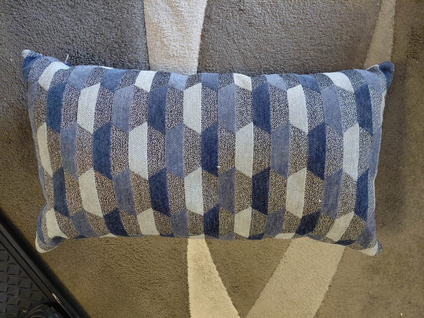 This 6" thick throw pillow features a geometric pattern in shades of blue and grey. It's perfect for adding a touch of modern design to your sofa or chair. Pillow cover is made of durable fabric. Packed with feathers and down. CASH ONLY. PICK UP ONLY.
