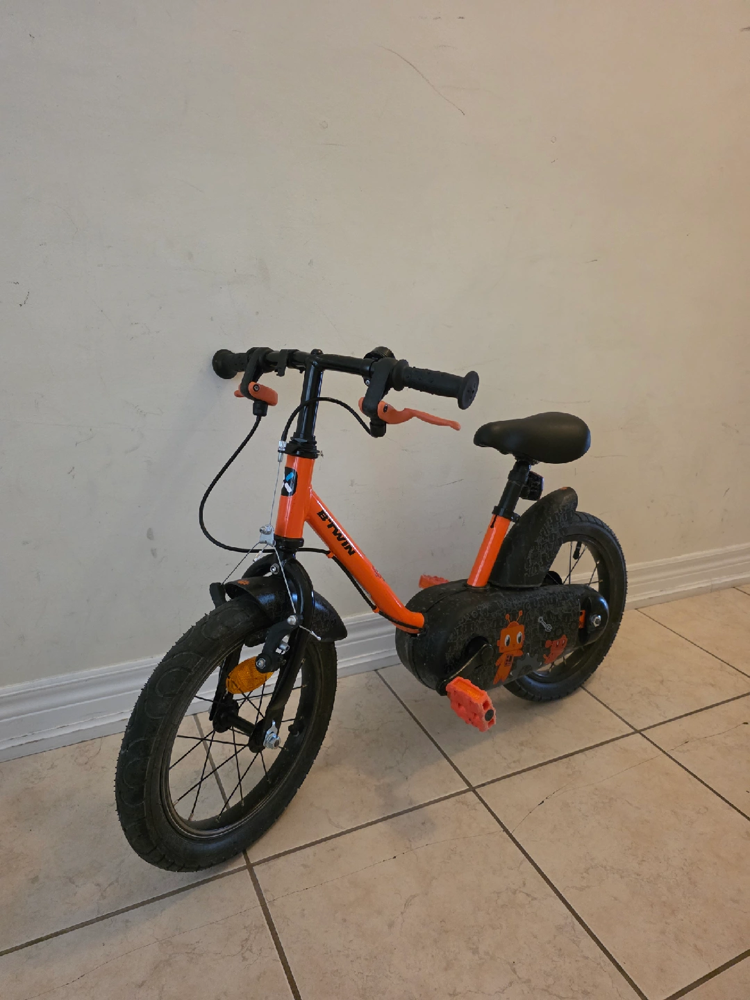 60Selling a Btwin kids' bike in good condition! It's perfect for 3-4 year olds learning to ride. The bike is orange and black. It has some signs of use, but it's still ready for plenty more adventures