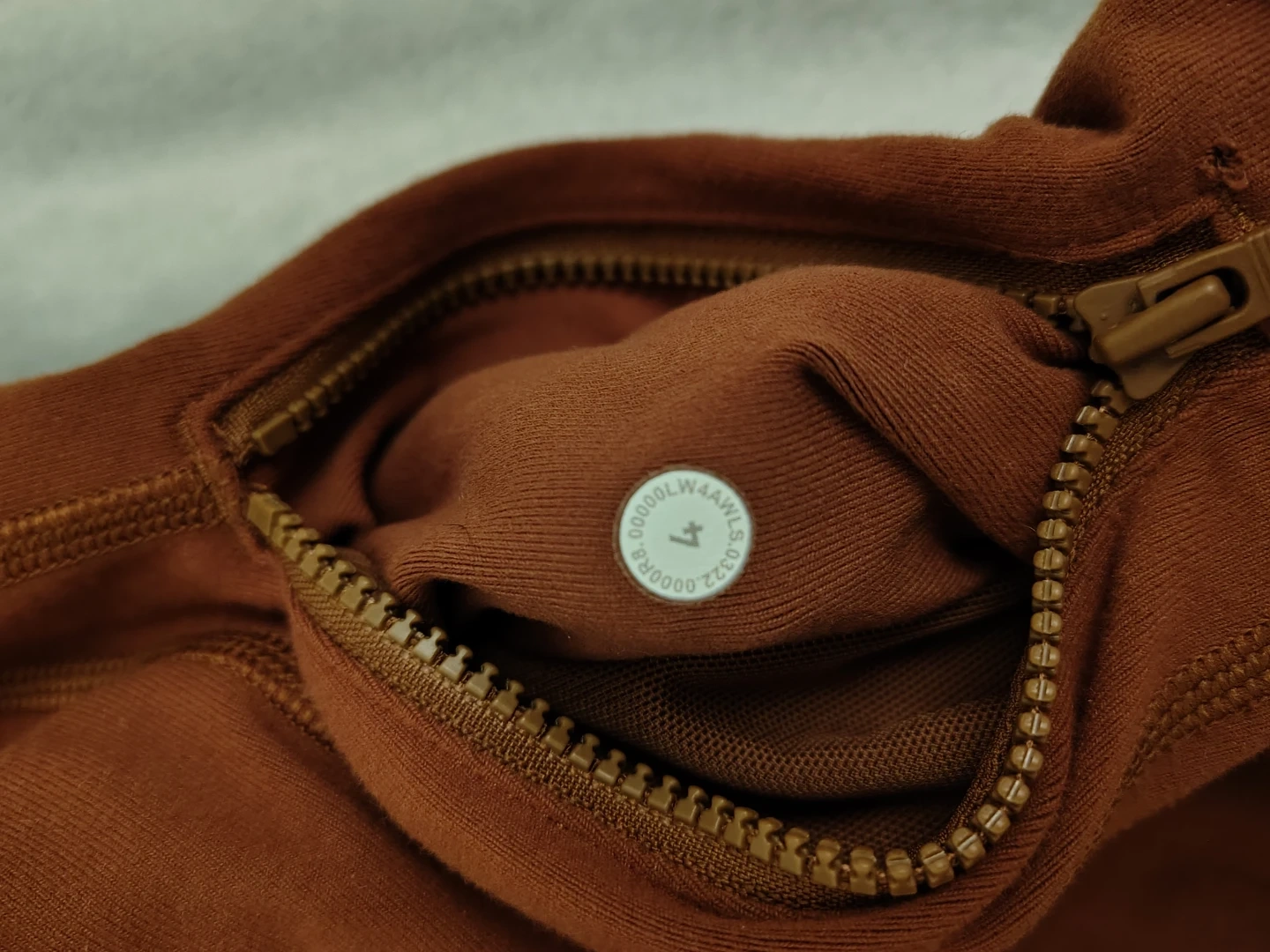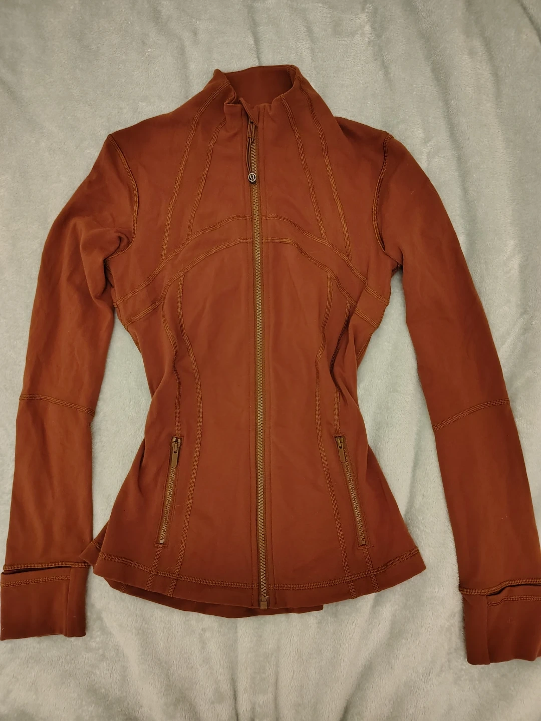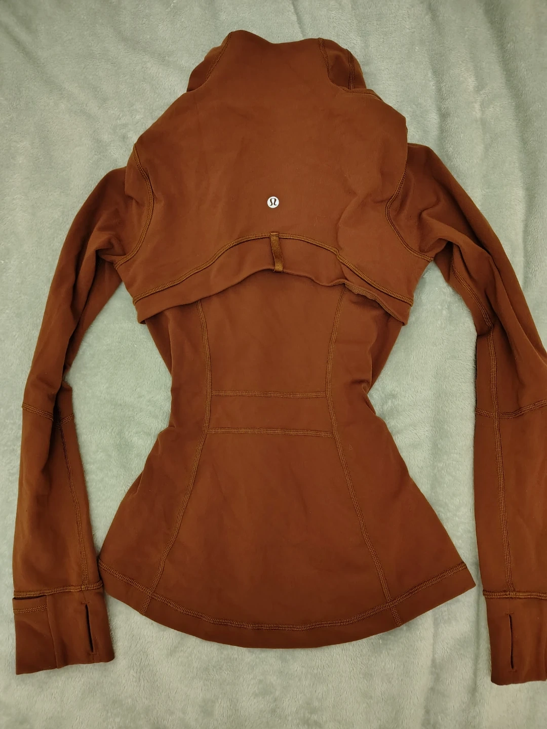 This is a Lululemon Athletica zip-up jacket. It has a full zipper closure and zippered pockets. Thumbholes are present on the cuffs.