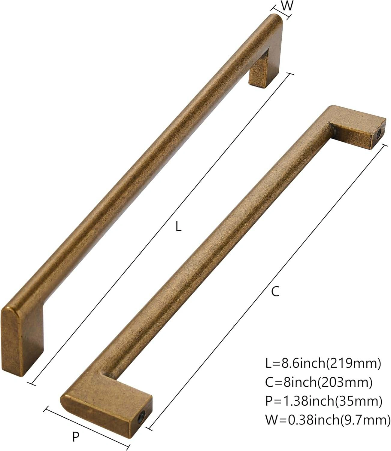 Selling cabinet handles that are 8.6 inches (219mm) in length. They have a centre to centre distance of 8 inches (203mm) and a width of 0.38 inches (9.7mm). Great for updating your kitchen or bathroom cabinets!
