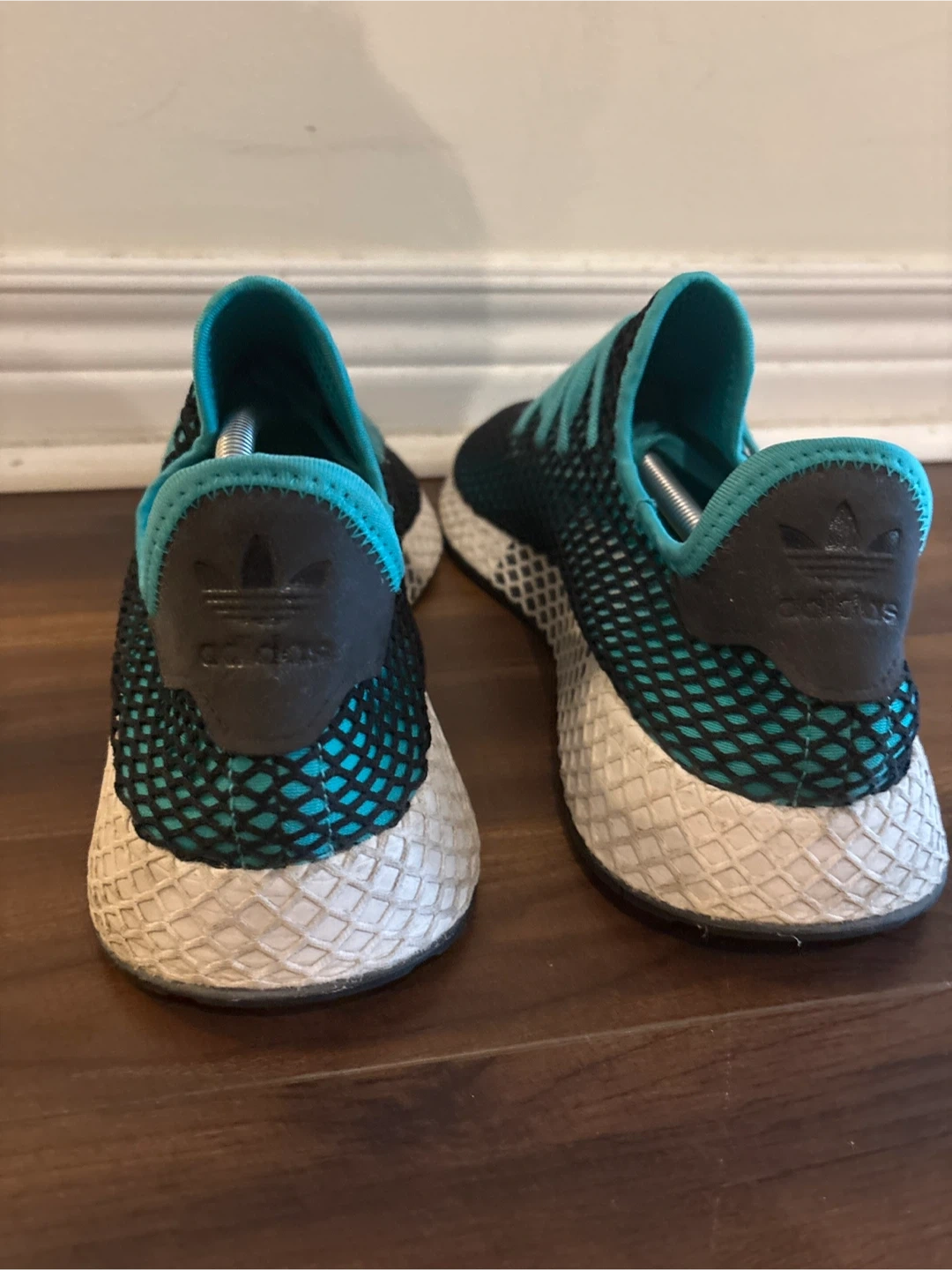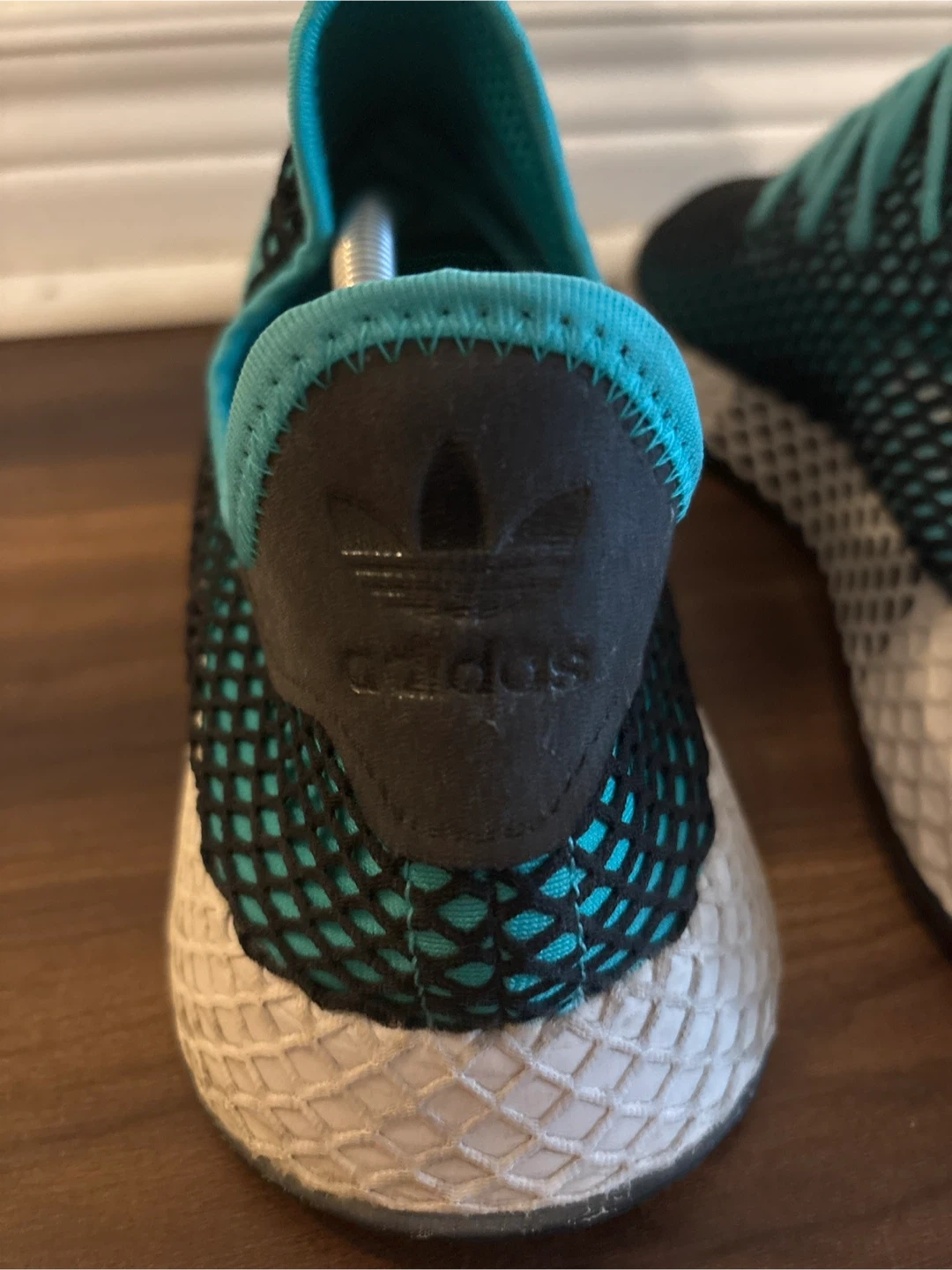 These Adidas Deerupt Runners are a cool teal and black colourway. They feature a mesh upper and a rubber outsole for durability. These kicks are awesome for everyday wear or light workouts!