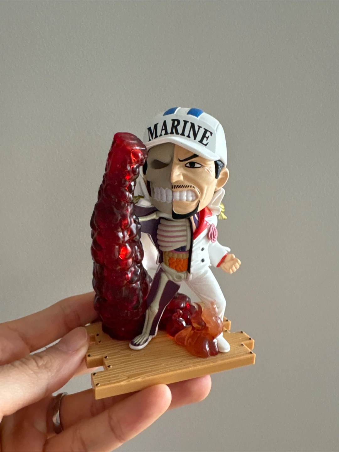 This is a One Piece Marine chibi style figure. It depicts a character with a split face, one half showing internal anatomy and the other his face with a Marine hat. It comes with flame and smoke-like accessories. Perfect for any anime fan's collection!
